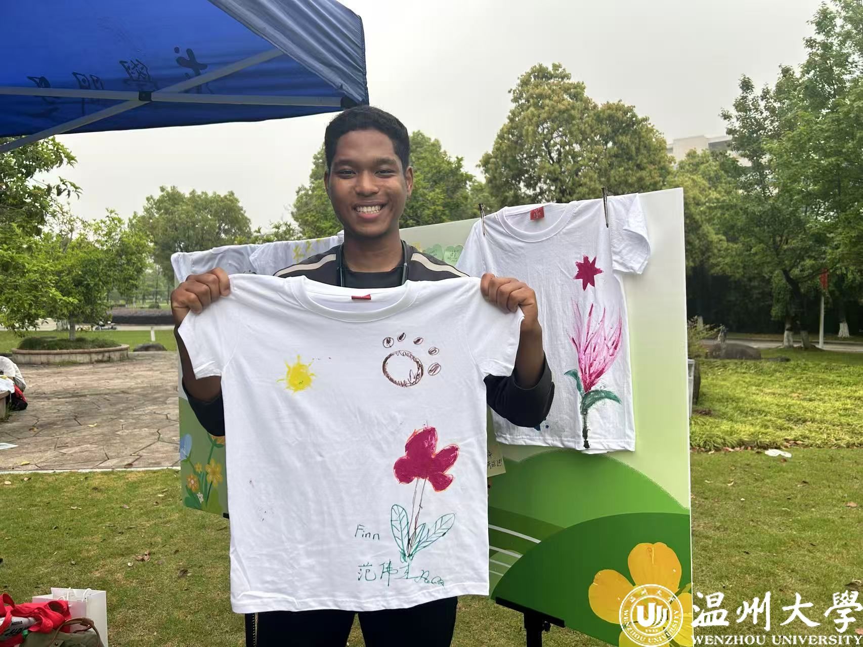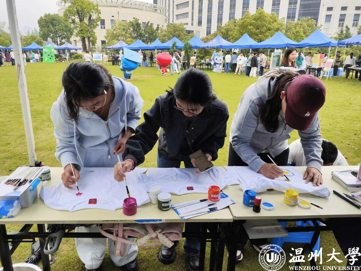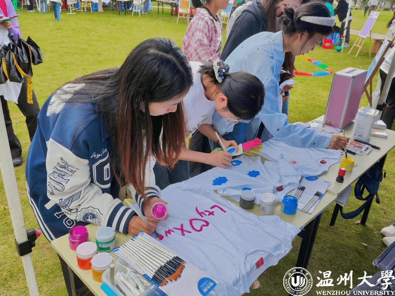 “艺术共鸣”区域同样热闹非凡。同学们手持颜料和画笔,在“共鸣涂鸦墙”上自由创作,用色彩和线条表达自己对情感或“共鸣”的理解;部分同学则在空白T恤上精心绘制图案、书写文字,完成后将这份独一无二的作品带走留念。通过艺术创作,同学们有效抒发了内心情感,加深了对自我和他人的认知。