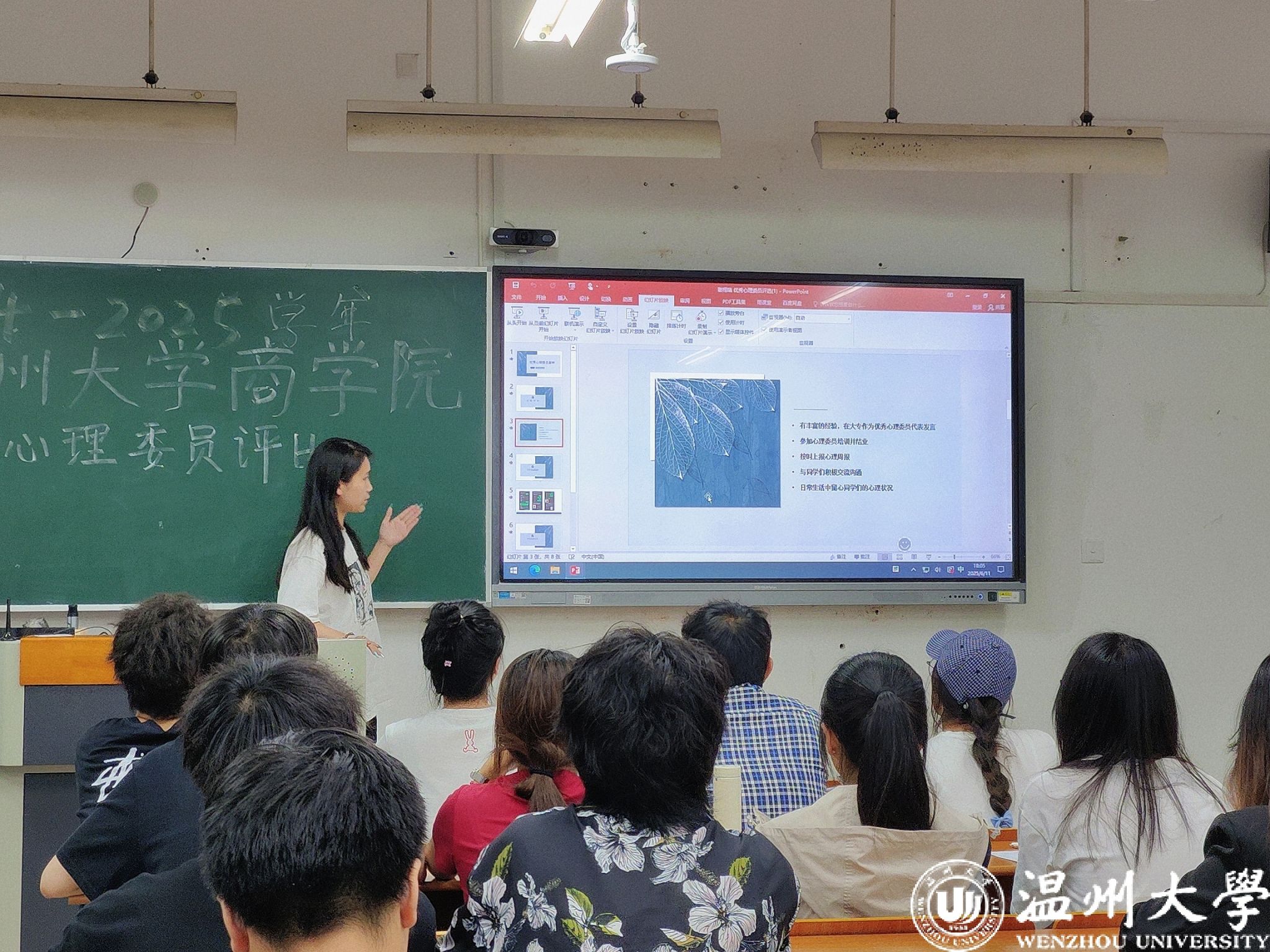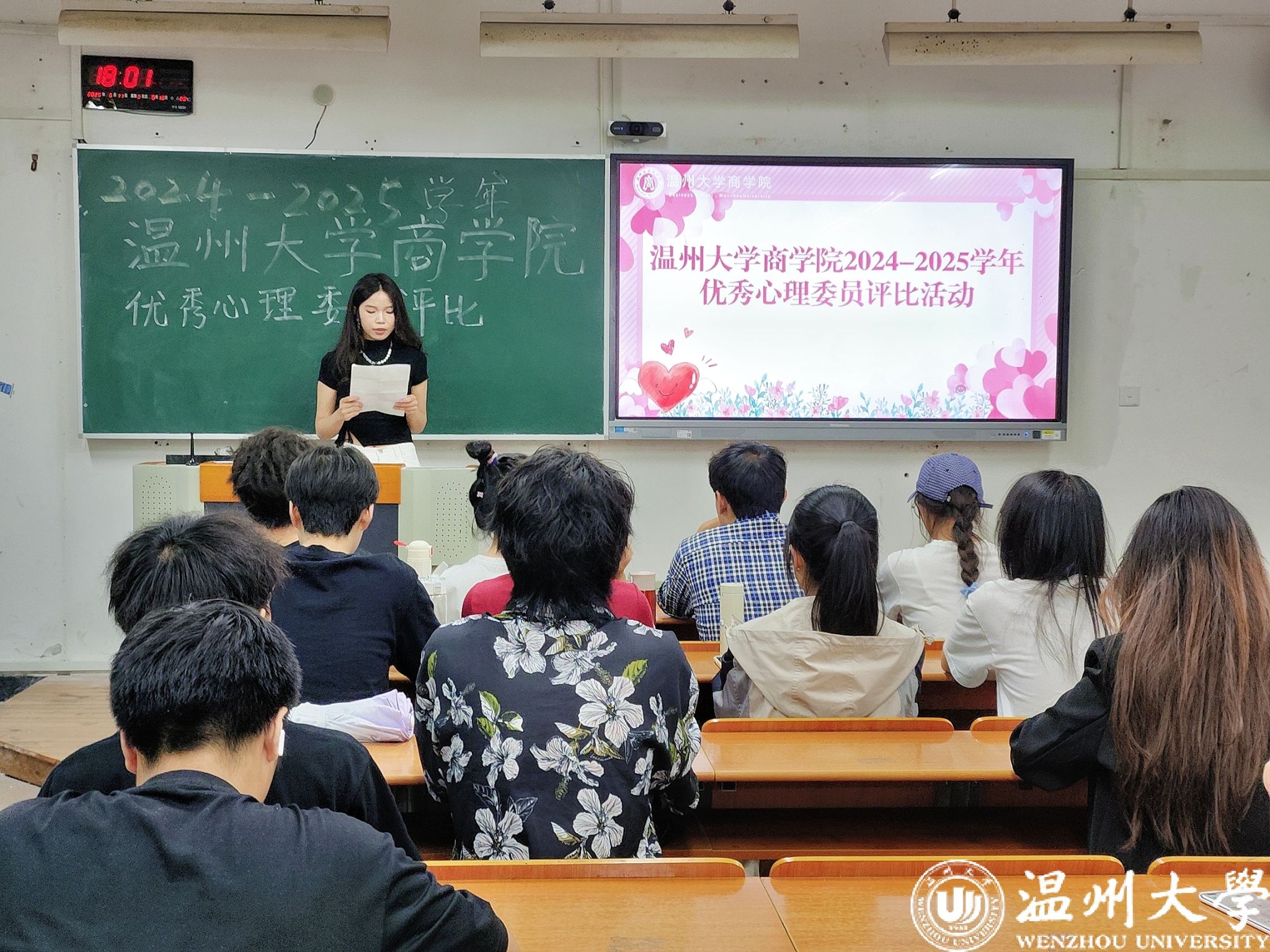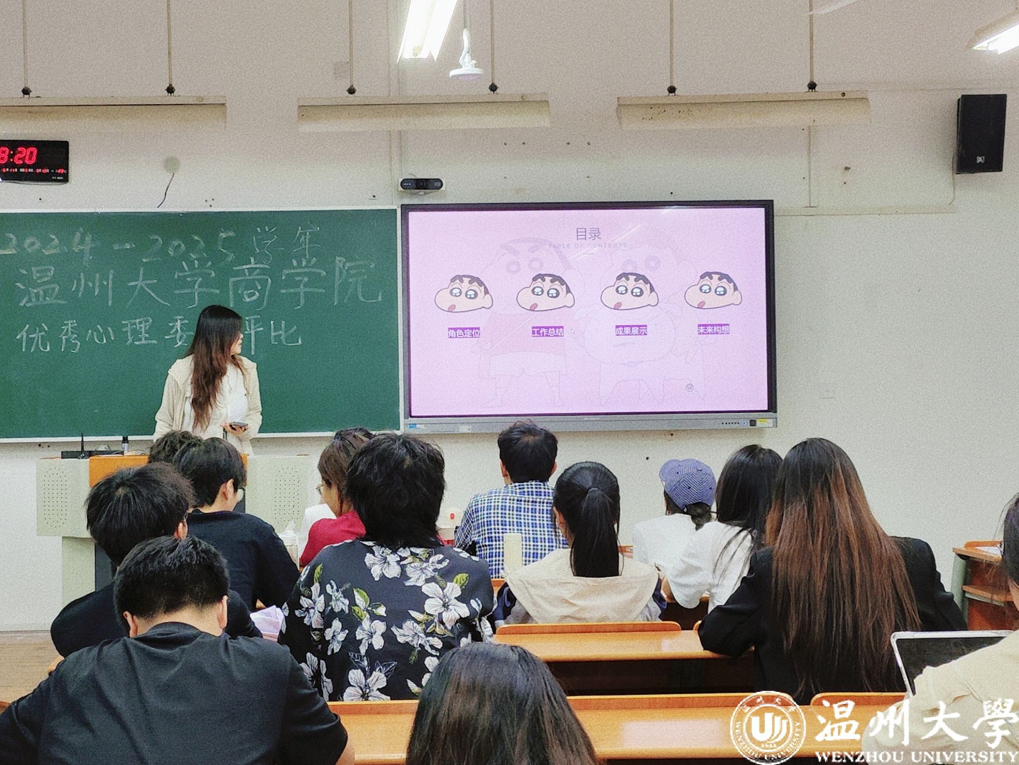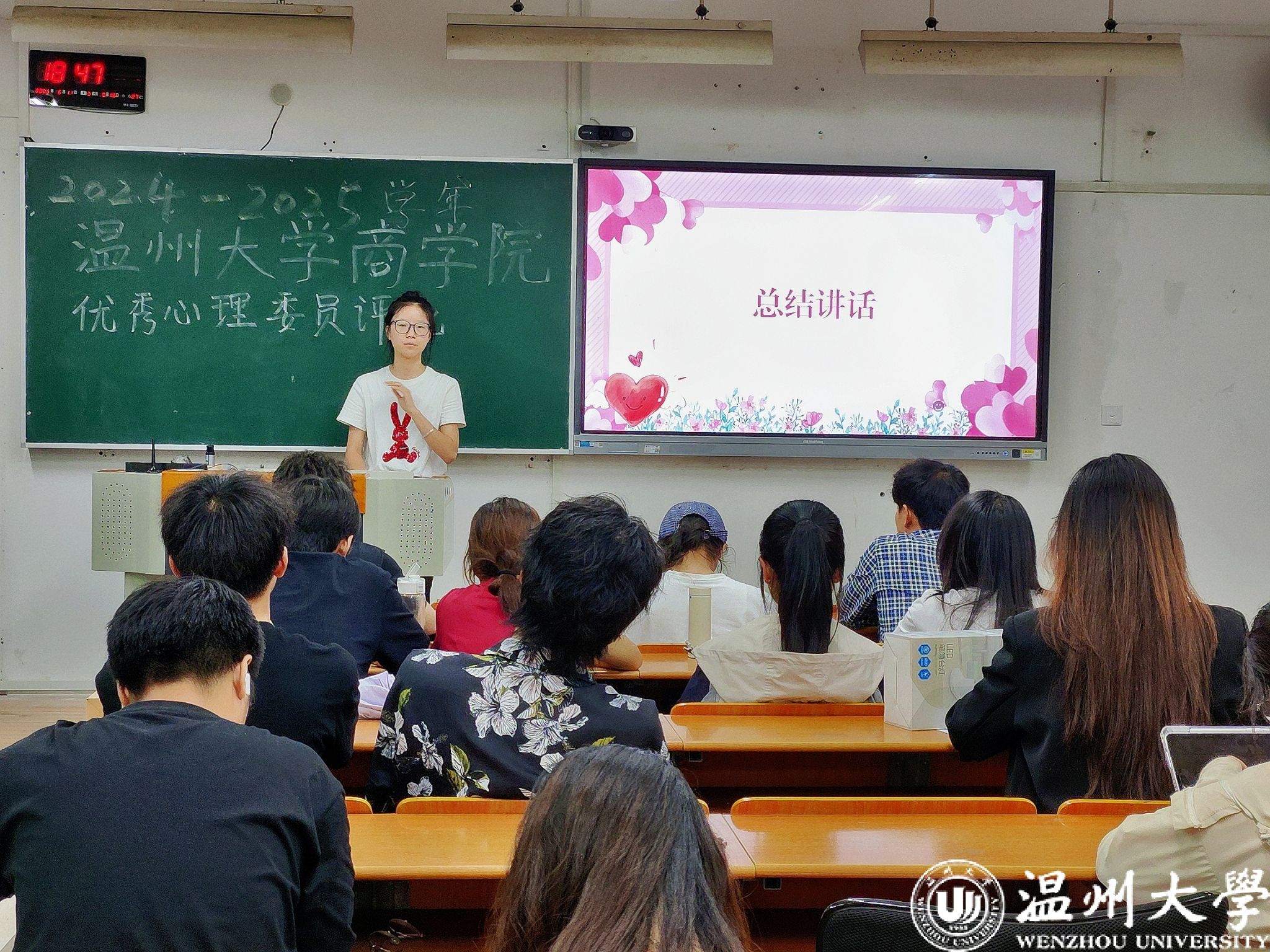 为持续强化学院学生心理健康教育工作,充分激发各班心理委员的工作热情与主动性,2025年6月11日晚,温州大学商学院素拓心理部指导老师聂海燕、温州大学商学院辅导员王长岳、温州大学商学院团委学生会执行主席张炜、徐子煊,温州大学商学院团委学生会团委副书记赵乐薇、王沭壬,温州大学商学院团委学生会素拓心理部执行部长周子怡、陆佳乐参加了温州大学商学院2024-2025学年优秀心理委员评选活动,评选活动由周祖妍同学主持。