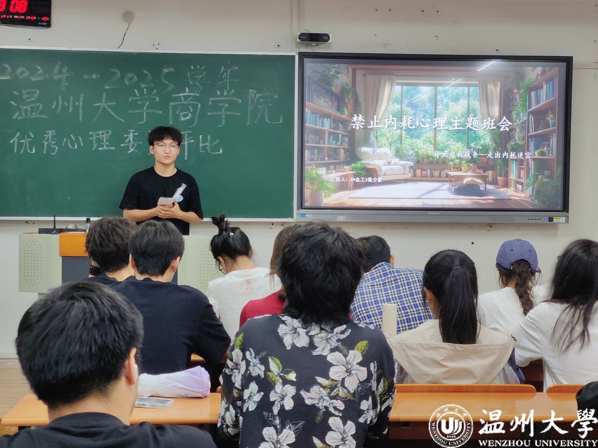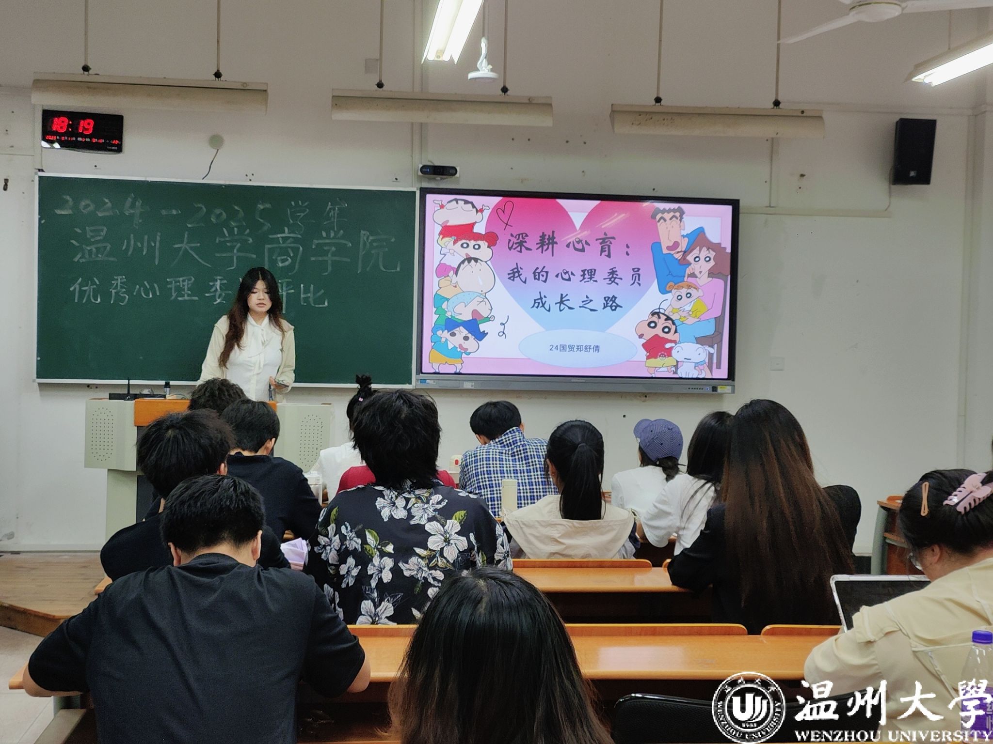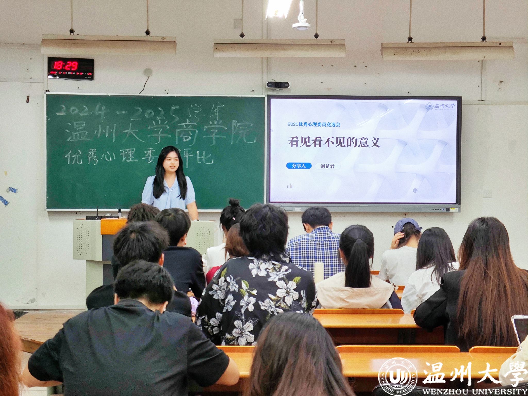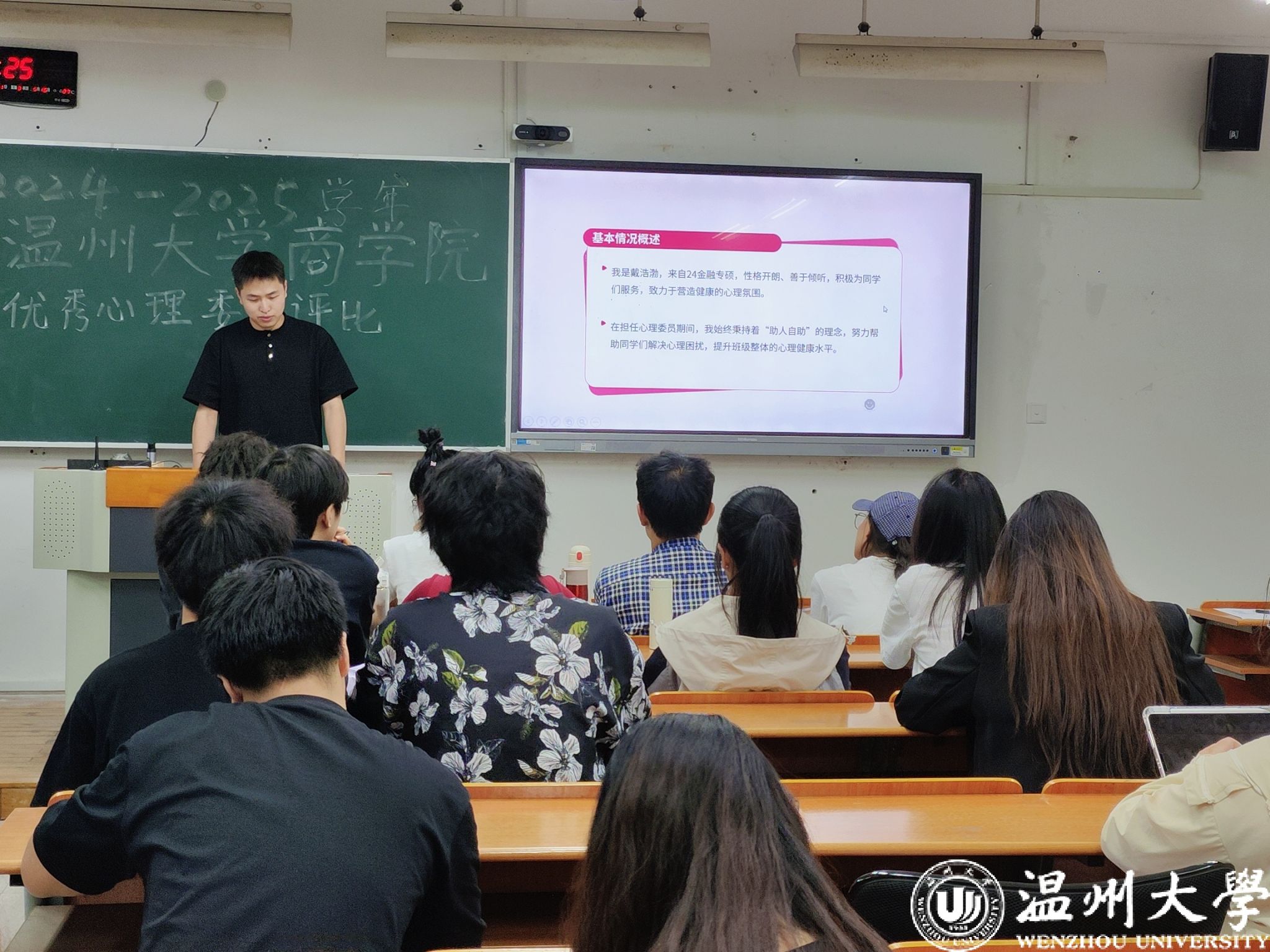 为持续强化学院学生心理健康教育工作,充分激发各班心理委员的工作热情与主动性,2025年6月11日晚,温州大学商学院素拓心理部指导老师聂海燕、温州大学商学院辅导员王长岳、温州大学商学院团委学生会执行主席张炜、徐子煊,温州大学商学院团委学生会团委副书记赵乐薇、王沭壬,温州大学商学院团委学生会素拓心理部执行部长周子怡、陆佳乐参加了温州大学商学院2024-2025学年优秀心理委员评选活动,评选活动由周祖妍同学主持。