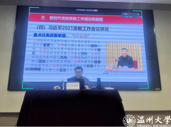 随后,王柏民老师以新时代党的宗教工作理论和制度为主要叙述对象,从习近平2021年宗教工作会议讲话中,深刻阐明了宗教工作具有特殊重要性,我们要坚持和发展中国特色社会主义宗教理论,支持我国宗教坚持中国化方向,要完整、准确、全面贯彻党的宗教信仰自由政策,尊重群众宗教信仰,依法管理宗教事务,坚持独立自主自办原则,积极引导宗教与社会主义社会相适应。