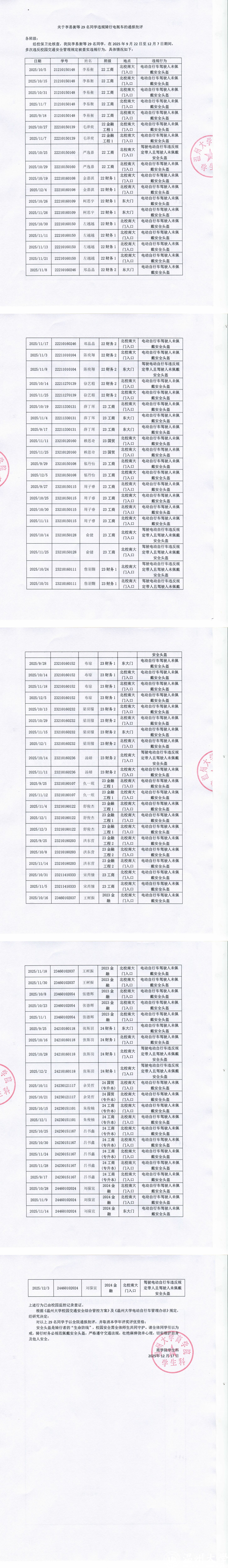 关于李易衡等29名同学违规骑行电瓶车的通报批评