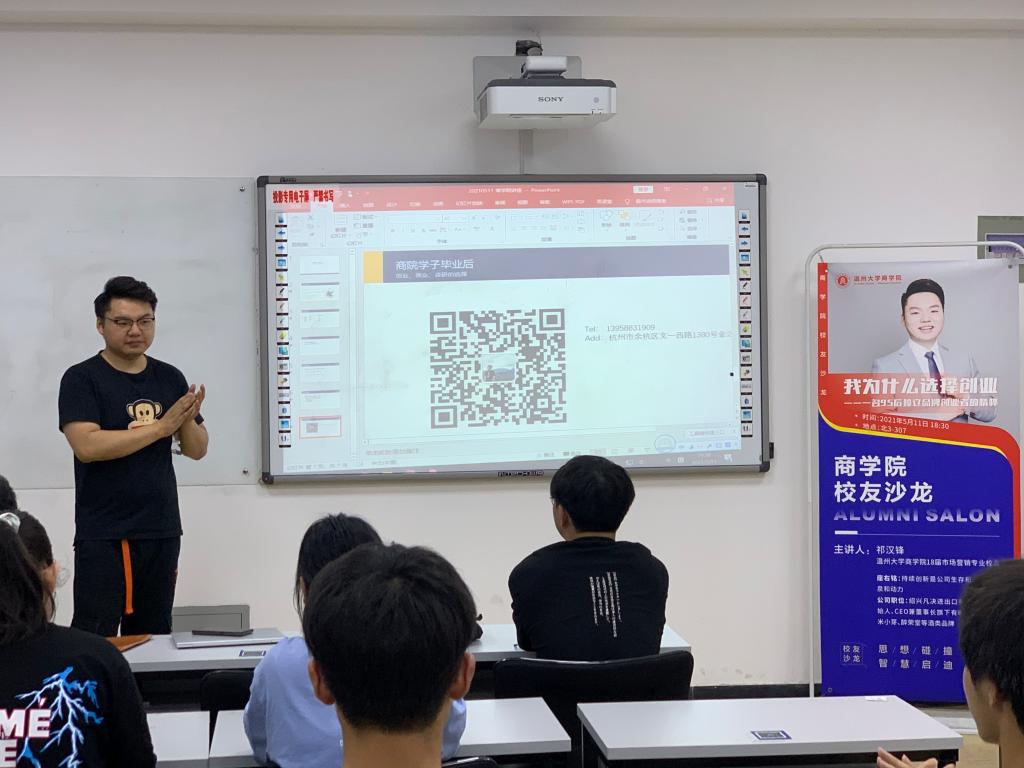 2021年5月11日晚,商学院第四期校友沙龙活动在北3-307教室如期举行。18届市场营销专业优秀毕业生,绍兴凡决进出口有限公司创始人、CEO兼董事长祁汉锋校友受邀以“我为什么选择创业——一名90后独立品牌创业者的情怀”为主题和在校生们分享了自己的创业故事。现场吸引了40余名在校生热情参与。