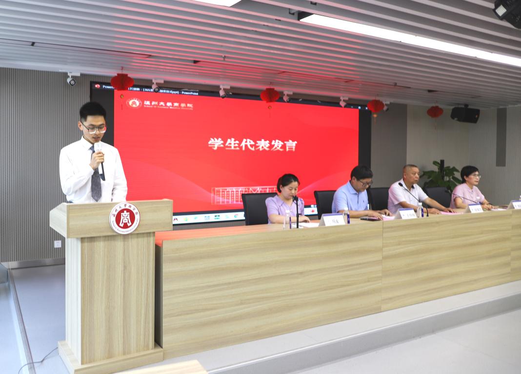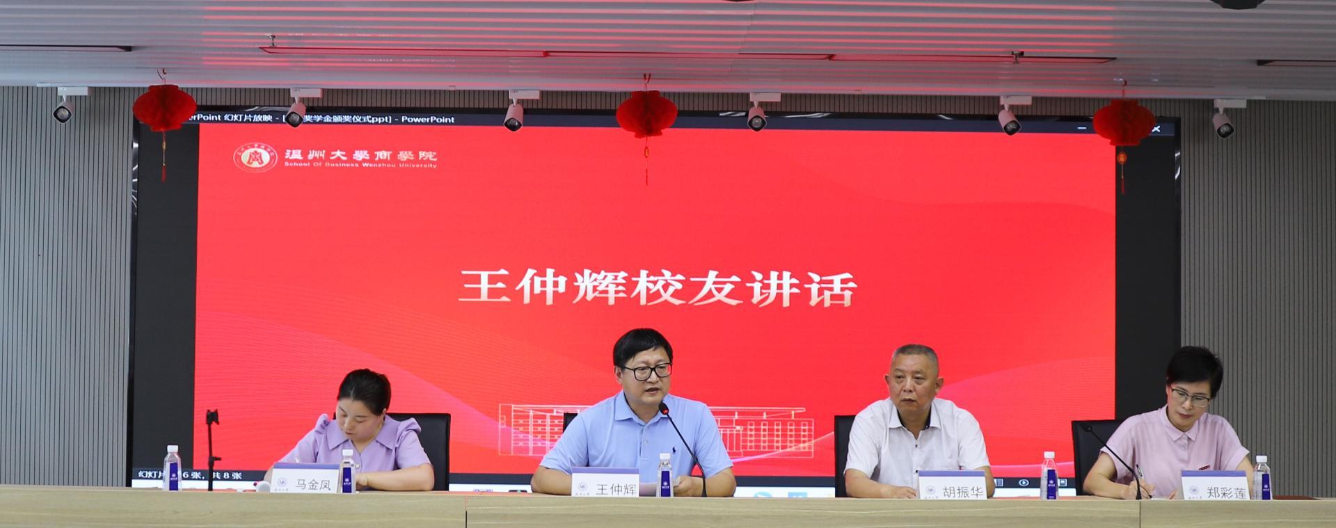 接着,王仲辉校友发表讲话,他表达了对母校深深的感恩之情,他说温州大学商学院是他人生迈出的第一步,被邀请参加此次颁奖仪式十分的开心。他鼓励获奖的学弟学妹们可以再接再厉。他用梁启超先生的《少年中国说》中的少年智则国智,少年富则国富,少年强则国强勉励商院学子,殷切期望学弟学妹们传承敢为天下先的精神,做对国家、对社会、对他人有用之人。