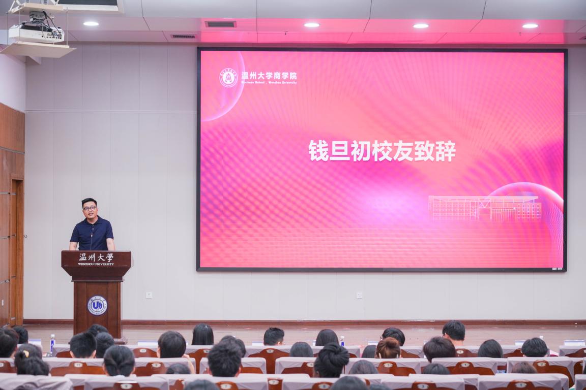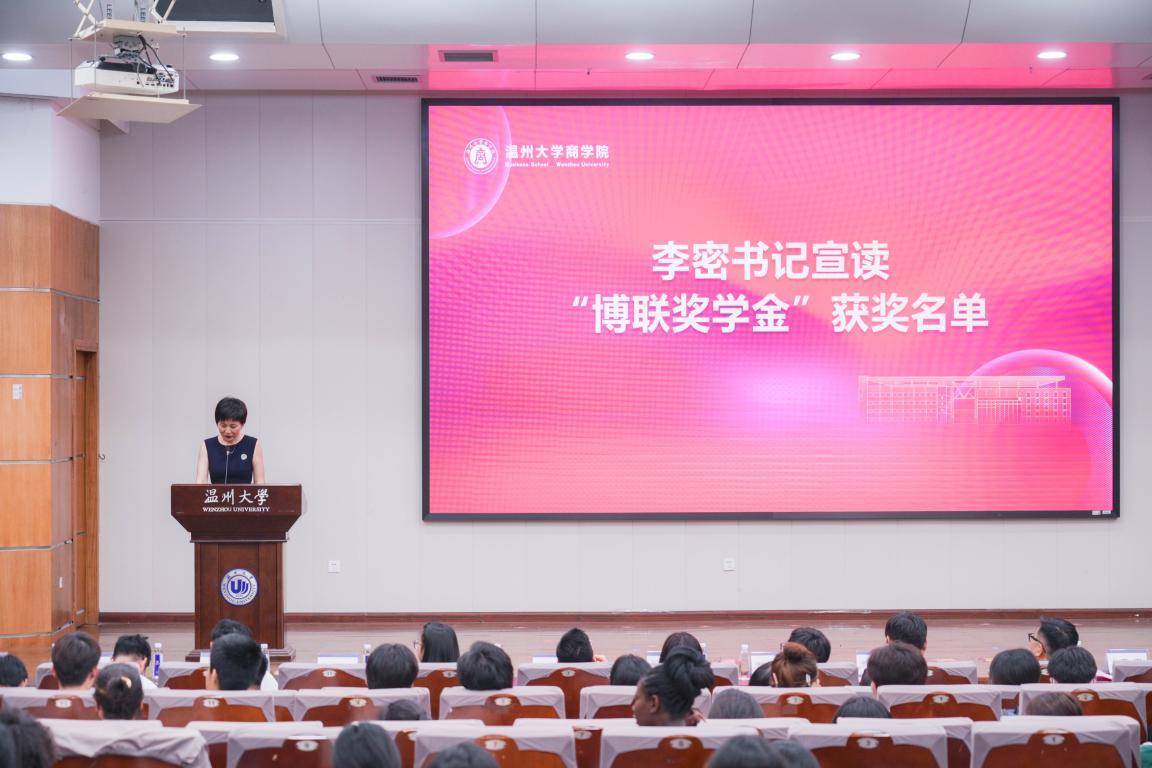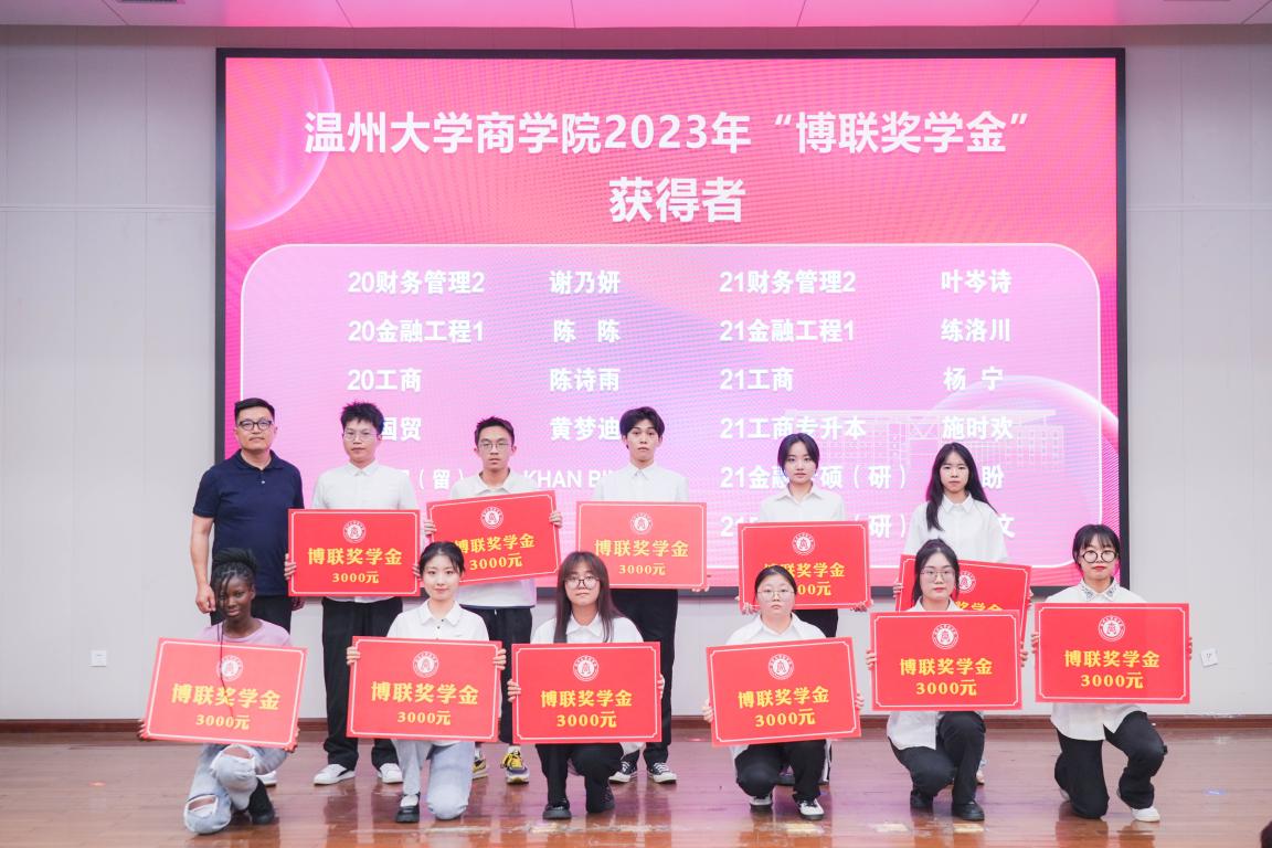 奖学金捐赠者之一、90外贸校友钱旦初先生到场为大家致辞,钱旦初校友在讲话中勉励学弟学妹们积极进取、奋发向上,鼓励每位在校生都要努力学习专业知识,对未来要抱有信心和期待。随后,李密书记宣读温州大学商学院第五届“博联奖学金”获奖名单,并由衷地祝贺获奖同学。钱旦初校友依次为11名获奖同学颁奖,并合影留念。