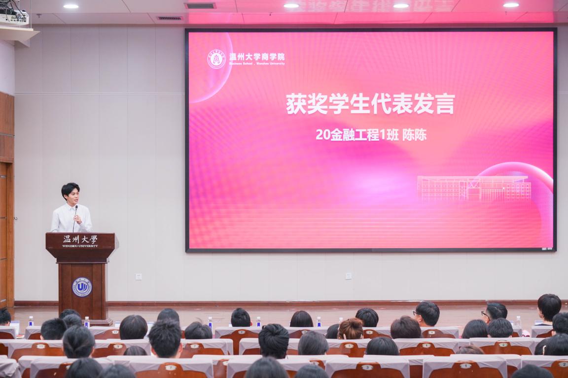 20金融工程1班的陈陈同学作为获奖学生代表发言。他谈到,自己从复读到专业第一的过程,鼓励学弟学妹们只要愿意付出,每个人都有机会在大学四年中发光发热。他对学校的培养和校友企业的资助关爱表达了诚挚的感谢,并表示将继续努力学习,完善自我,不忘初心,砥砺前行,在将来为母校的建设献出自己的一份力量。