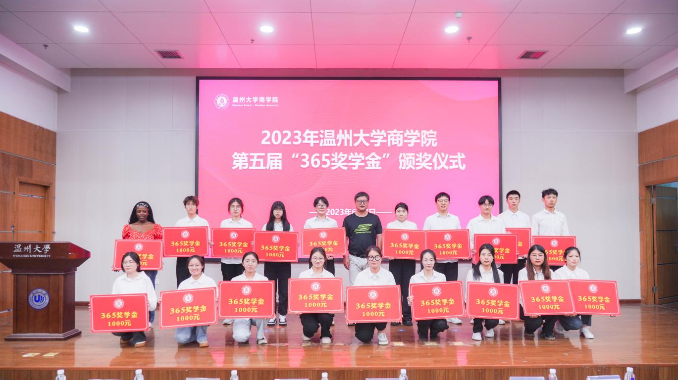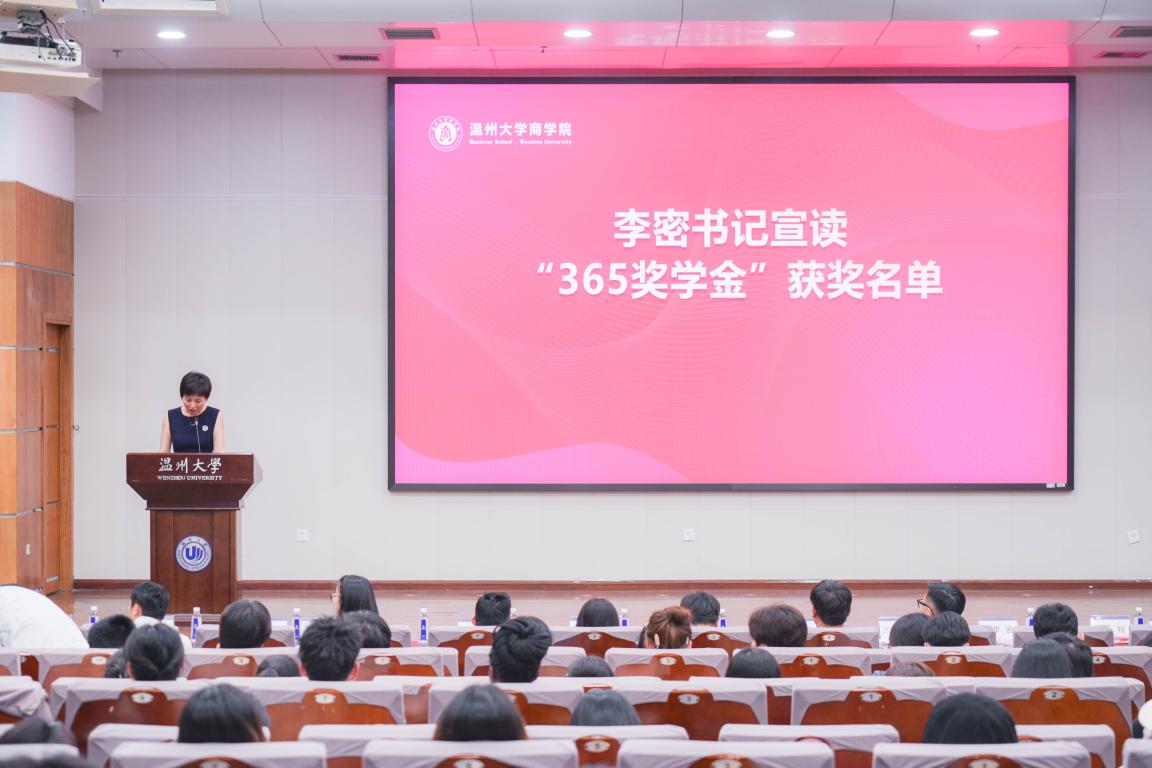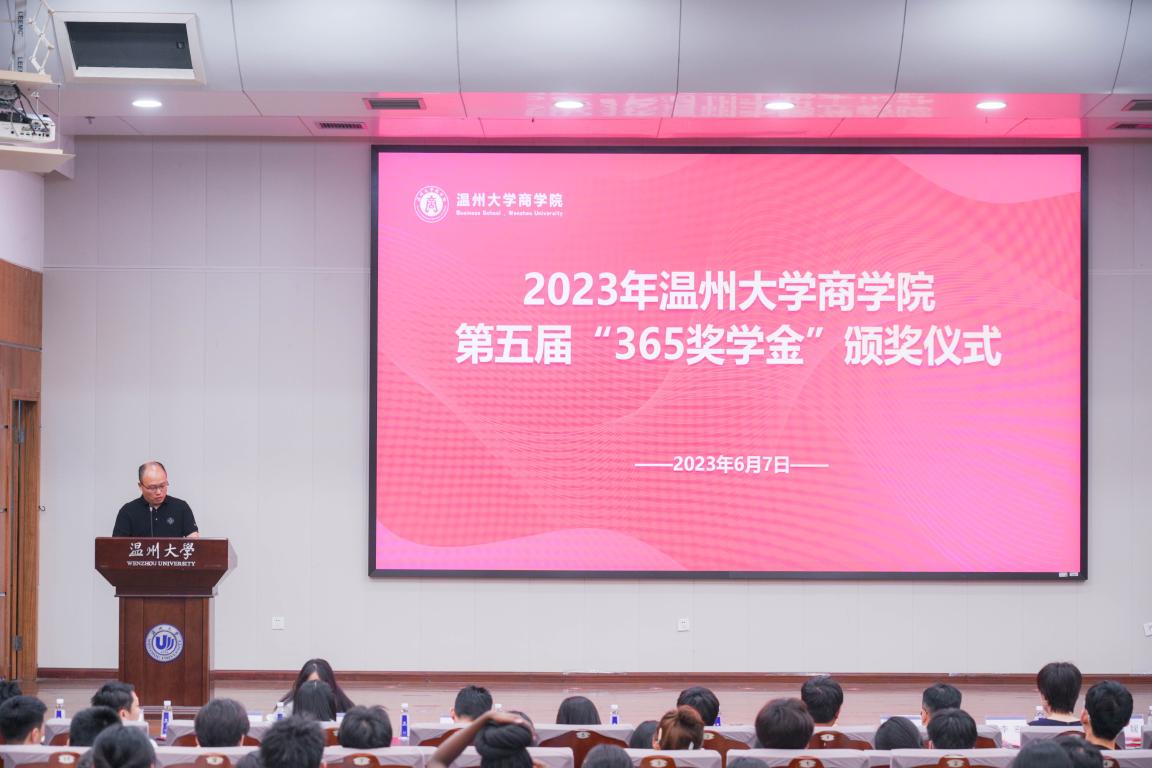 王仲辉校友发表讲话,他对获得第五届"365奖学金"的师弟师妹们表示热烈祝贺,并带来了精彩的演讲。随后,李密书记宣读温州大学商学院2023年"365奖学金"获奖名单,王仲辉校友为获得"融商奖"、"学业奖"、"青年奖"的19名同学逐一颁奖并合影留念。
