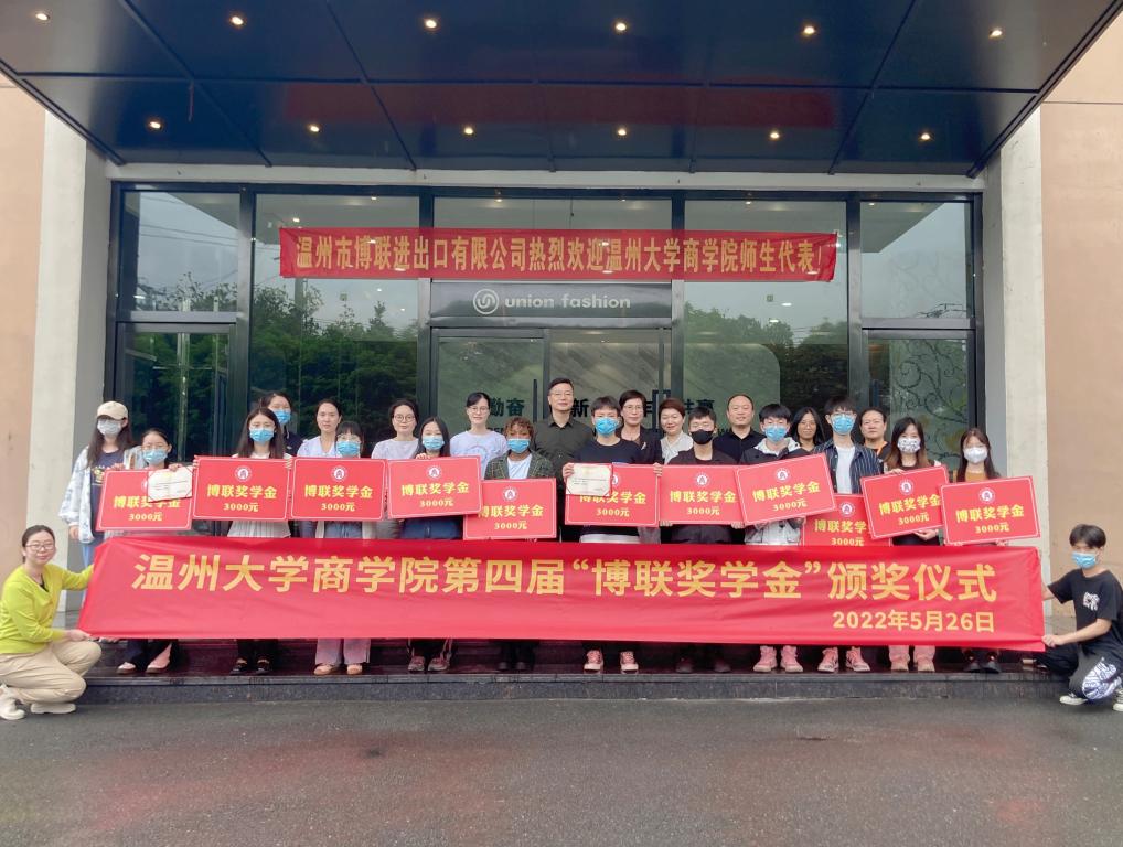 2022年5月26日下午,温州大学商学院第四届“博联奖学金”颁奖仪式如期举行,本次颁奖仪式在温州市博联进出口有限公司举行,获奖学生们通过实地参观交流,近距离感受了校友企业文化。学院党委书记郑彩莲、党委副书记唐华、学工办主任周洁文、获奖学生及学生代表参加了本次活动。活动由唐华副书记主持。