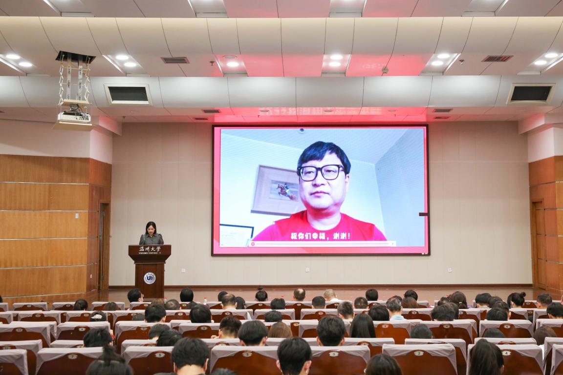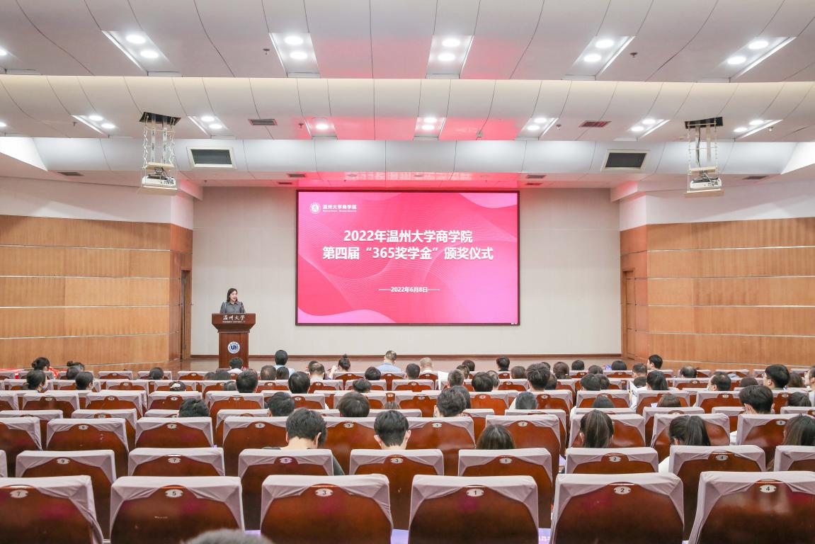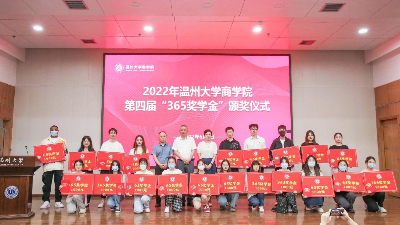 “365奖学金”由我院91财会优秀校友、上海叁陆伍投资管理有限公司董事长王仲辉于2018年捐资设立,专项用于奖励品学兼优、全面发展的商院学生。王仲辉校友虽受疫情影响无法亲临现场,但他仍然录制视频,对获得第四届“365奖学金”的师弟师妹们表示热烈祝贺。随后,金瑞老师宣读温州大学商学院2022年“365奖学金”获奖名单,胡振华院长、郑彩莲书记、唐华书记分别为获得“融商奖”、“学业奖”“青年奖”的20名同学颁奖。