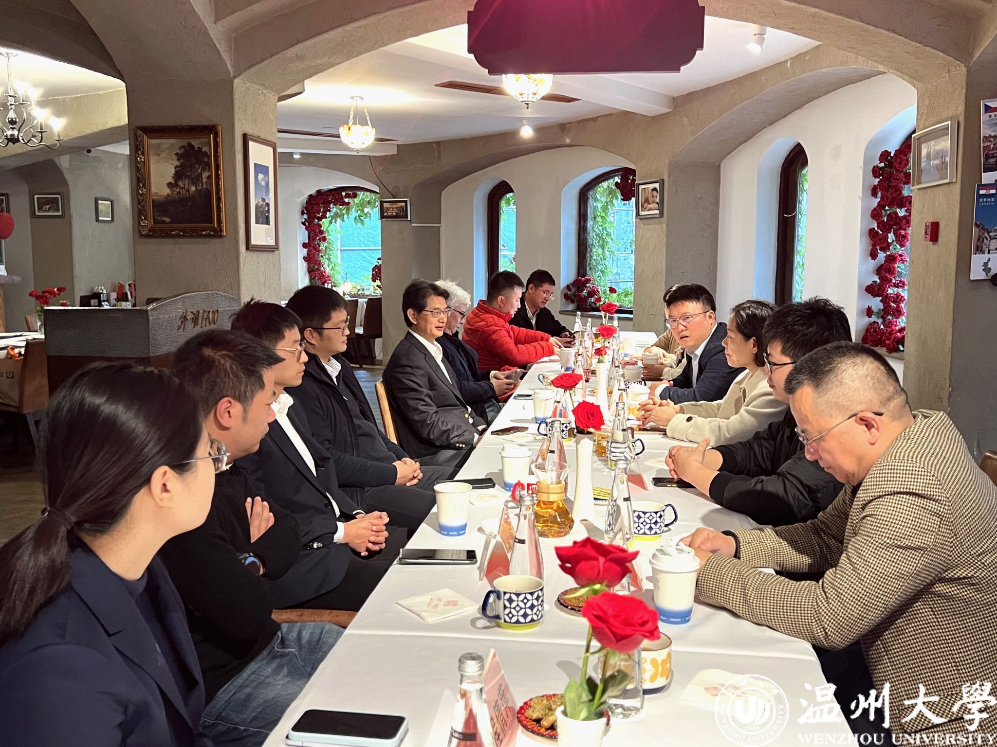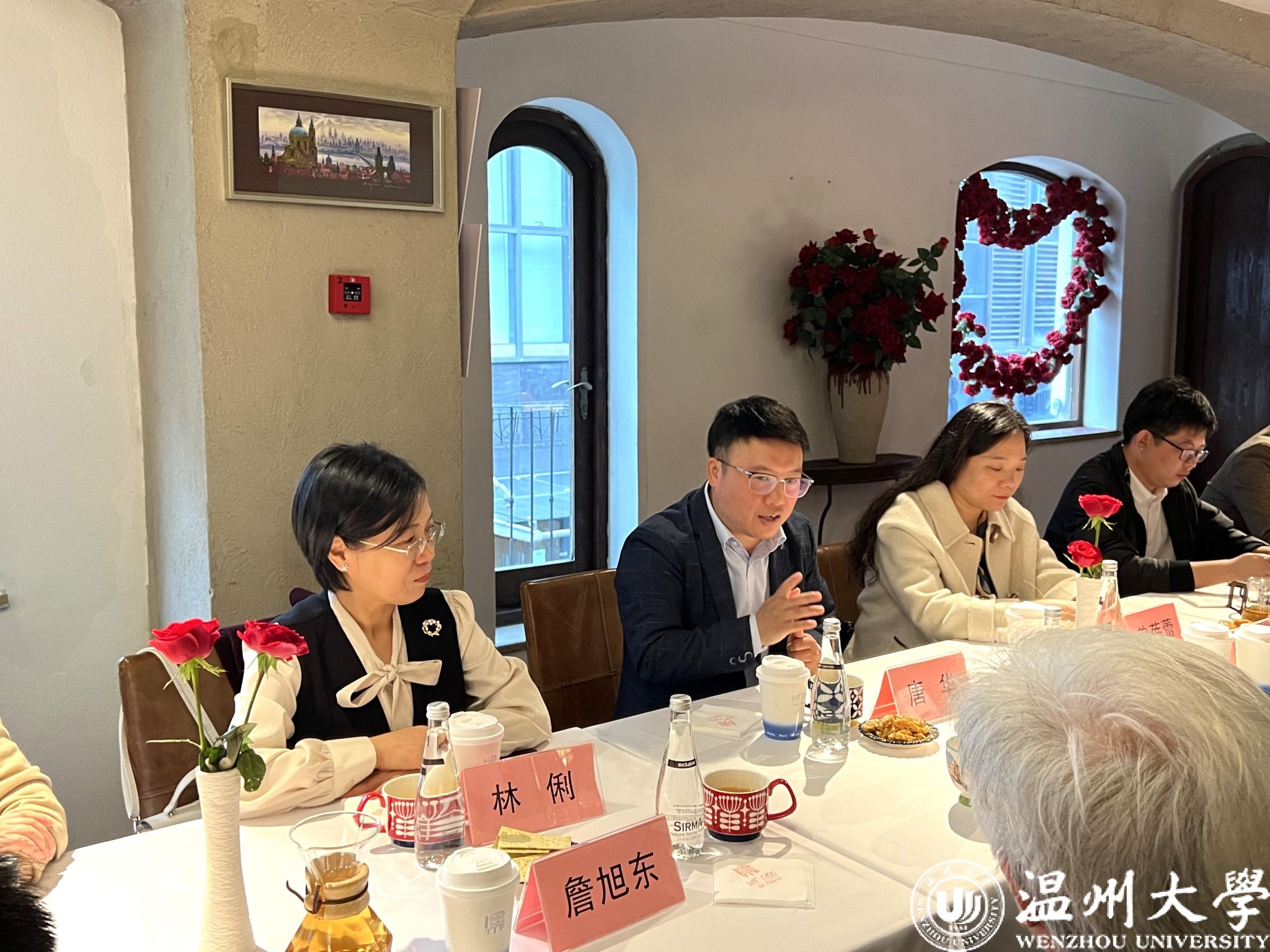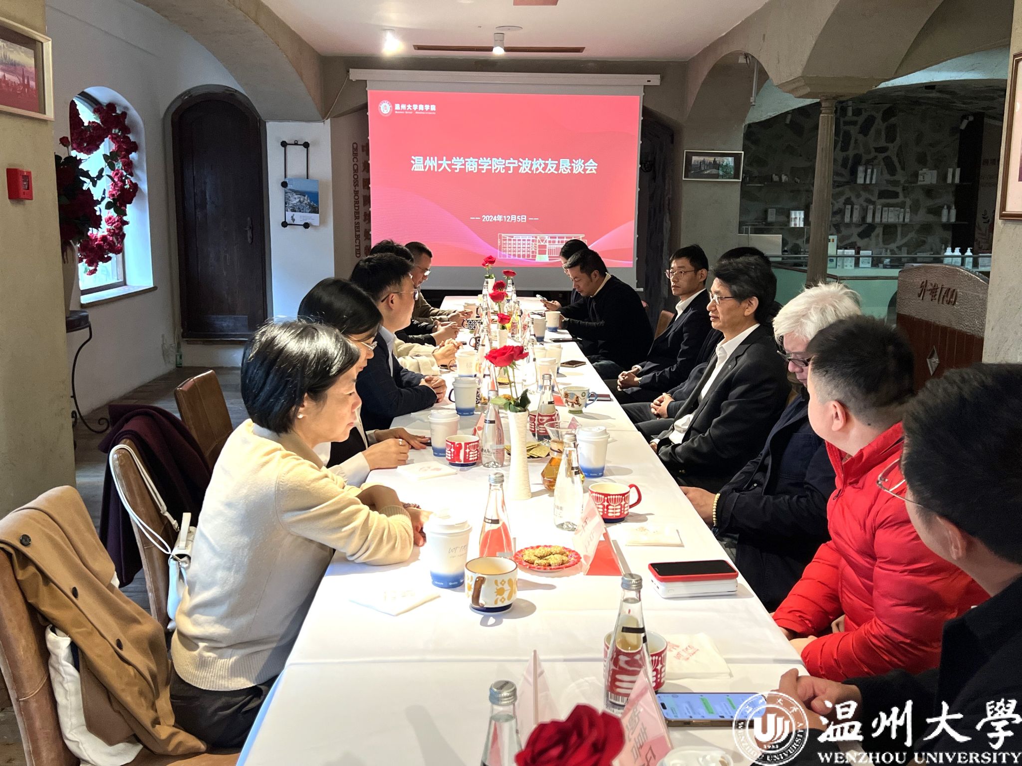 12月5日,温州大学商学院在宁波老外滩成功举办宁波校友恳谈会。商学院党委书记唐华、党委副书记曾蓓蕾,“国一流”专业国贸专业负责人林俐等一行人出席活动,并与陈友相(85外贸经济,中宁化集团有限公司总裁、中国-中东欧国家联合商会副主席,现任宁波校友会会长)、陈斌(07经济学,东莞证券宁波分公司总经理)、董袁(08经济学,工商银行宁波鄞中支行行长)、陈金星(07级财务管理,中宁化集团有限公司集团审计合规部总经理)、骆炜炜(08国际贸易,杭州润培化妆品责任有限公司销售总监)、詹旭东(86外贸经济)等10余位校友进行深入交流。