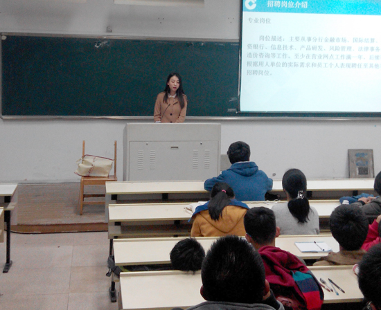 2014年12月4日,北校区3号楼201座无虚席,周洁就金融知识学习方法、银行工作特点和银行招聘情况同大家一一分享,鼓励大家在校期间好好学习,不要虚度时光,在学好专业课的同时,积极培养自己的组织能力和交际能力。最后,同学生就自己关心的话题同校友进行了交流。