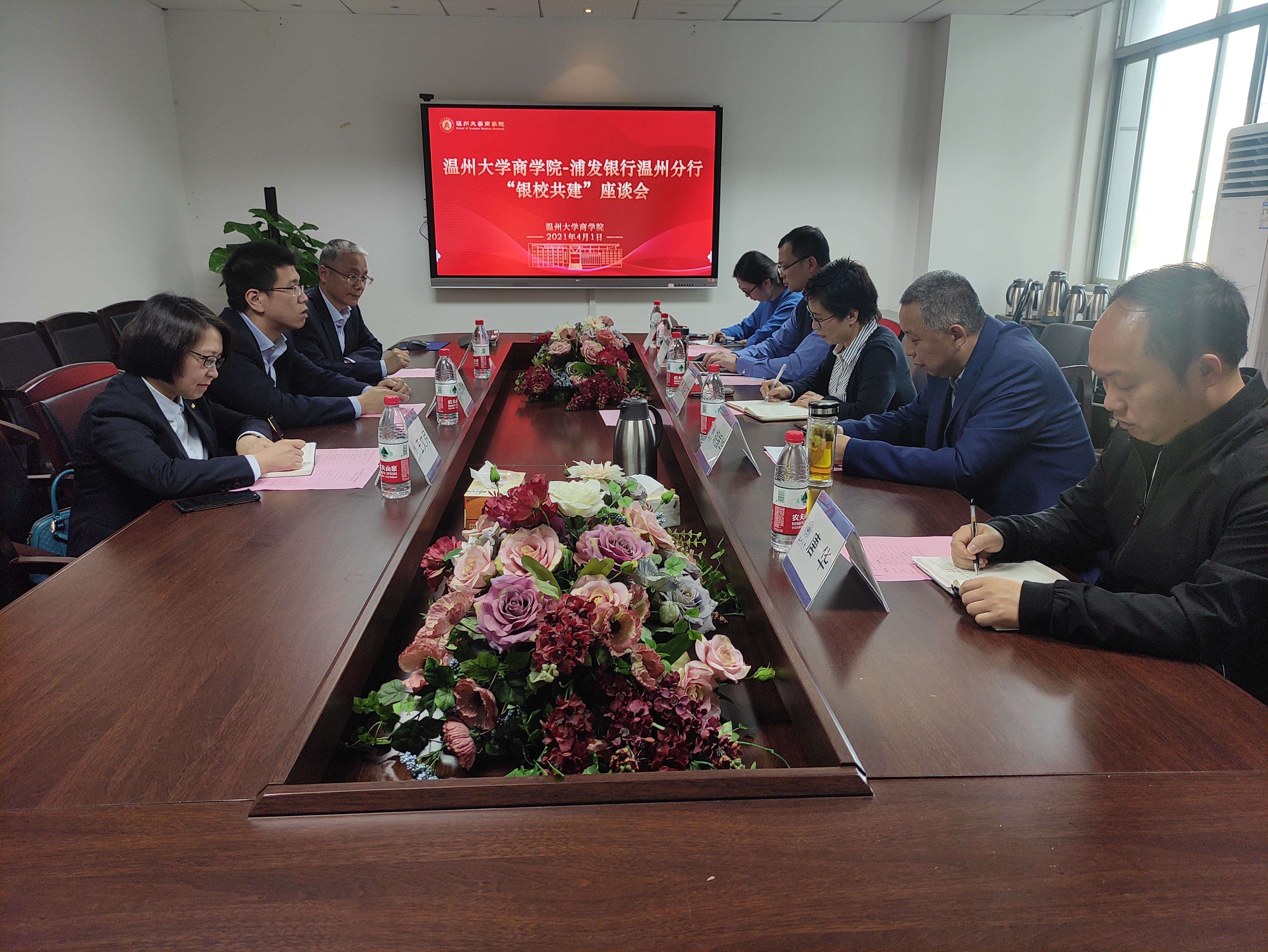 4月1日上午,浦发银行温州分行党委书记、行长任剑栋一行来院交流,学院党委书记郑彩莲热情接待并主持召开座谈会,学院院长胡振华、副院长余向前、党委副书记唐华、学工办副主任周洁文一同参与座谈。