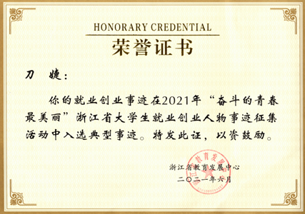 近日,2021年“奋斗的青春最美丽”浙江省大学生就业创业人物事迹征集评选结果正式揭晓,温州大学商学院学生刀婕荣获“基层就业大学生典型人物”。