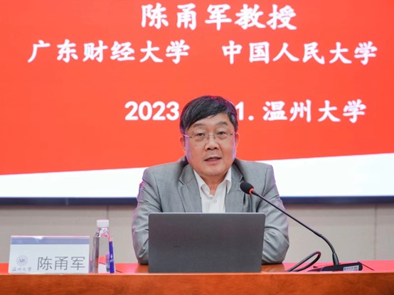 形势与政策课程是高校思想政治理论课的重要组成部分,是面向大学生进行政策解读与形势分析的主要阵地。为帮助学生深入了解国家形势与政策,坚定政治立场,2023年4月21日下午,温州大学商学院邀请中国人民大学教授、广东财经大学大湾区双循环发展研究院院长陈甬军教授在育英图书馆二楼报告厅为大家带来题为“共建‘一带一路’十年的机制分析与前景展望”专题讲座。