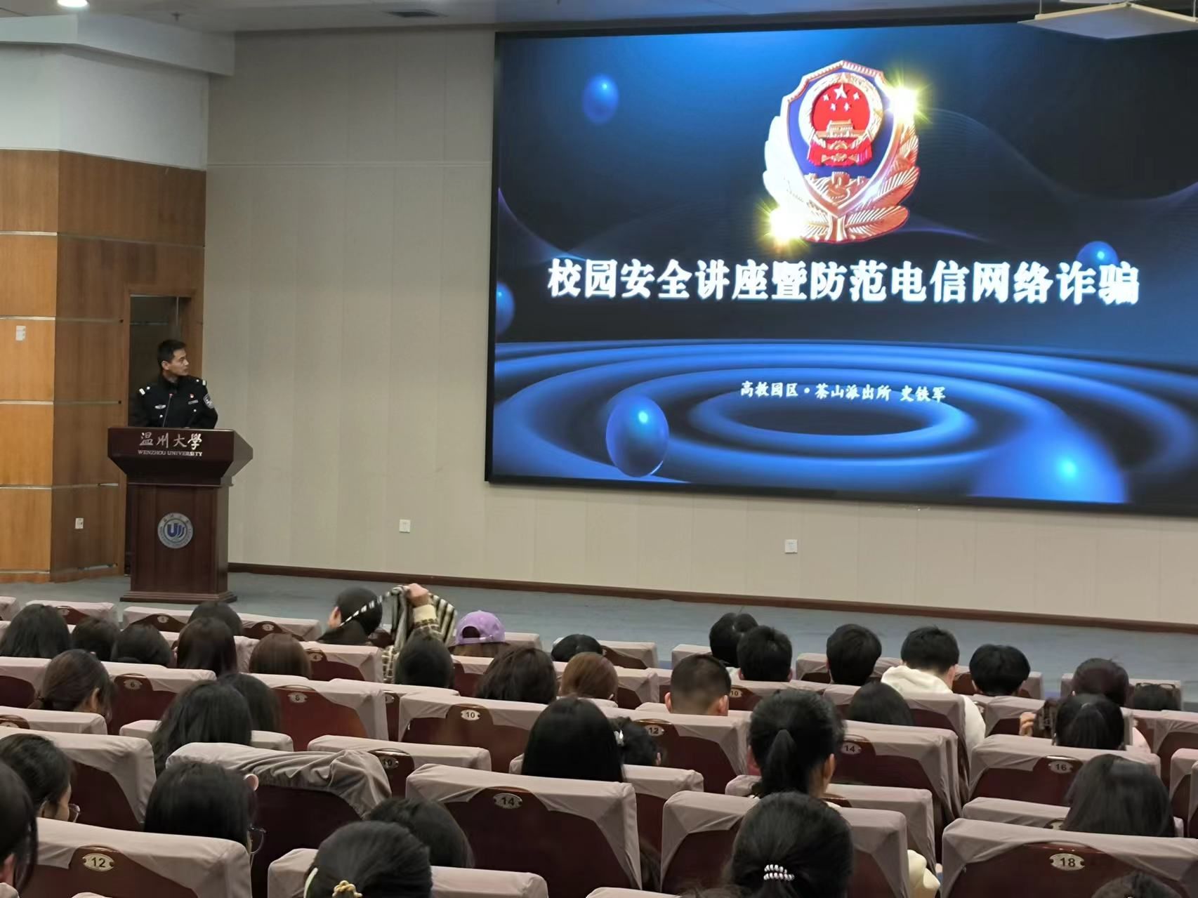 高教园区派出所民警史铁军警官为同学们进行防诈防骗宣防暨反对网络谣言、不造谣不信谣不传谣的安全宣讲工作。田警官结合真实案例,为教职工剖析了电信诈骗的常见类型和手段,了解不同诈骗方式的典型特点以及防范要点,并且提供了实用的防电诈技巧和建议,让同学们能够切实了解电诈危害,提高防范意识。