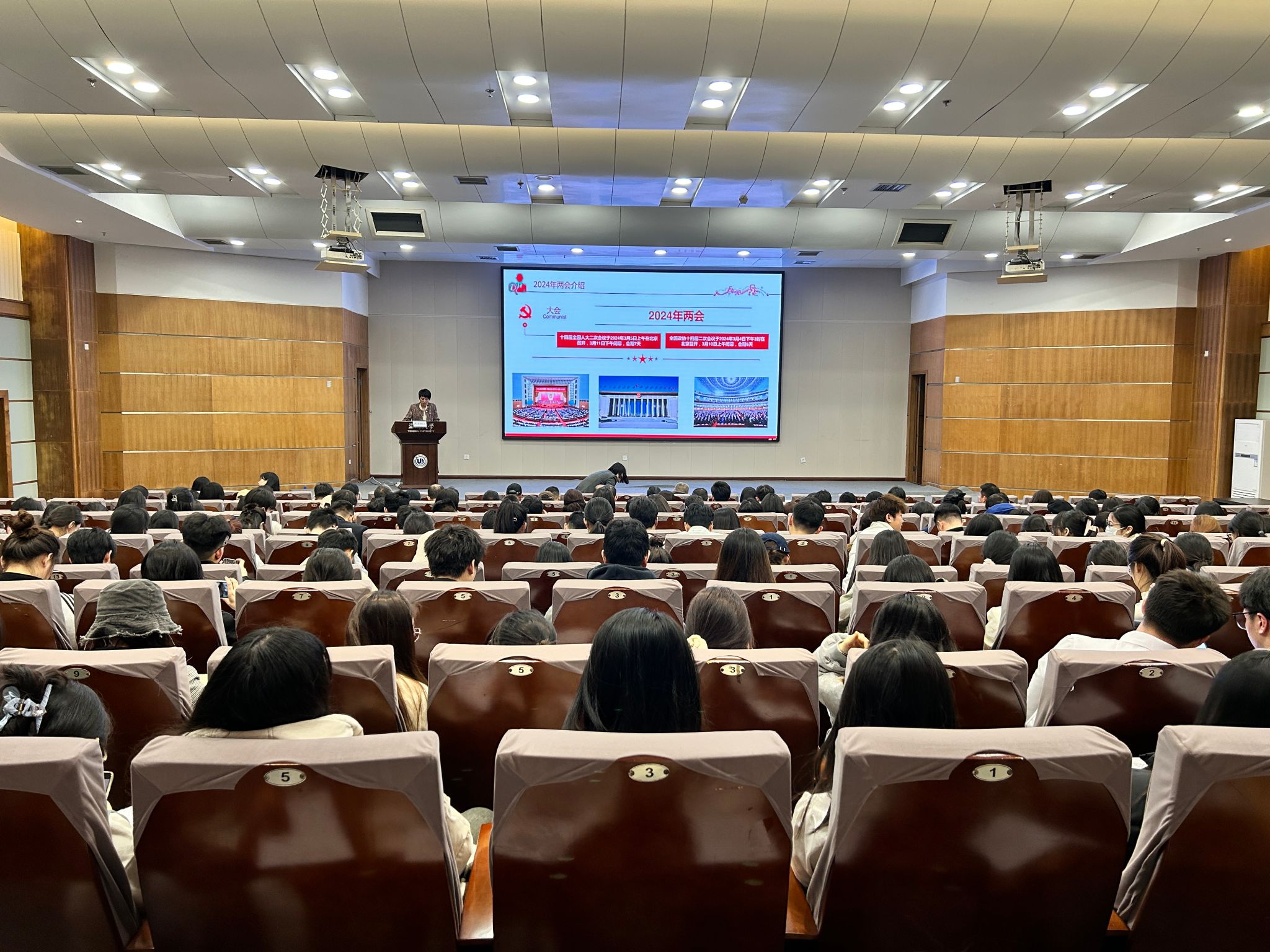 商学院党委书记李密为同学们讲授《学习两会精神》专题“形势与政策”课。她首先向同学们普及了全国两会的相关知识,接着详细介绍了十四届全国人大二次会议和全国政协十四届二次会议的基本情况和主要会议精神,从九个方面重点介绍了习近平总书记在参加两会期间的重要论述,从2023年工作回顾、2024年主要预期目标、2024年经济社会发展政策取向、2024年政府工作十大任务四个方面详细解读了政府工作报告。整个讲解过程主题鲜明、内涵丰富、分析透彻,所有参会同学对两会精神有了深刻的理解、全面的把握。