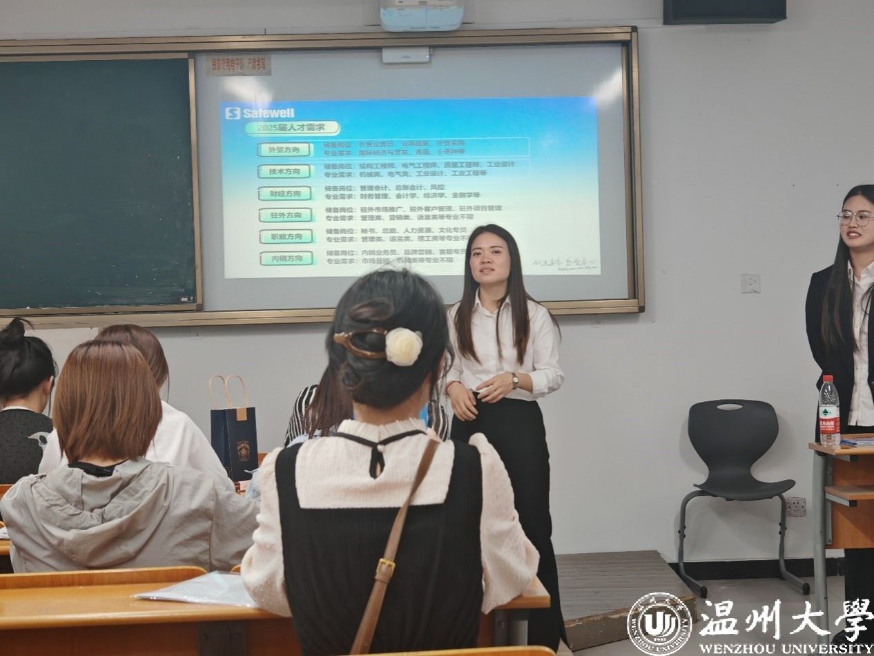 2024年10月23日18时,盛威国际2025届校园招聘宣讲会在温州大学北校区北2-111成功举行,本次宣讲会由盛威国际集团和温州大学商学院团委学生会就业创业部共同承办。