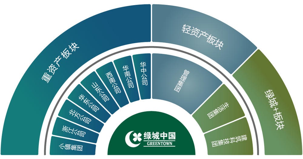 在“品质为先”的发展战略指引下,绿城中国布局房地产上下游业务,形成重资产、轻资产和“绿城+”三大板块。重资产板块聚焦房产开发业务,轻资产板块强化代建业务,“绿城+”板块为两者提供强力支撑,上游加强产业整合,下游提升服务内涵。