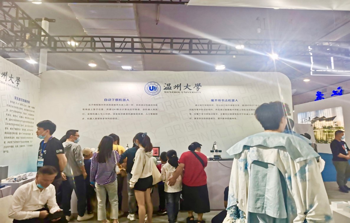 数字化车间软件系统、新型环保高分子笔头、功能PVB膜材料、聚乳酸可降解材料、云衣尚秀——虚拟时尚秀、自动下棋机器人、魔术师书法机器人、米可智能速热饮水机、Babynice儿童电动指甲剪、创新成果(温大)位于院校创意展区,由我校创作的科技工作者进行现场讲解,支持观赏、互动、体验、分享经验,展示学校的科技成果转化和产业化能力。为了吸收我校创业经验,来自温大商院的创业协会社员们先是体验了云衣尚秀——虚拟时尚秀,以3D动画与虚仿科技为支撑,模仿并替代传统服装设计开发到发布的繁琐过程,戴上3D眼镜,切身真正体验了一番堪称现场走秀的一次时装发布秀,而后询问关于创作的一些想法经验,令人耳目一新,不禁令人惊艳感叹温大创业青年的新智慧新思想。接着围观观赏自动下棋机器人的精妙,其中一名社员还得到魔术师书法机器人所写的一段送给朋友的祝福”早日脱单“极其温馨可爱的一段字。而后也陆续了解了一些新型材料,对未来的环境大有裨益的一些创业成果。