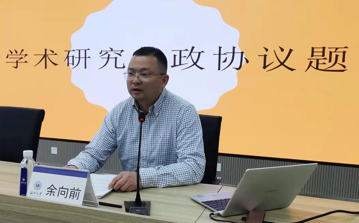 温州市第十二届政协委员、商学院副院长余向前教授作题为《学术研究与政协议题》的报告。他从三个方面与大家交流本次的政协之履,一是介绍政协议题模板,他提出要选题好、多调研、强应用,同时要主动履职,多发言多提案,二是介绍科研与议题在时效性、严谨性、专业性方面的差异,并介绍了自己的科研课题是如何转化为政协议题的,三是为大家提出服务地方、对接温州市经济建设的几点建议。