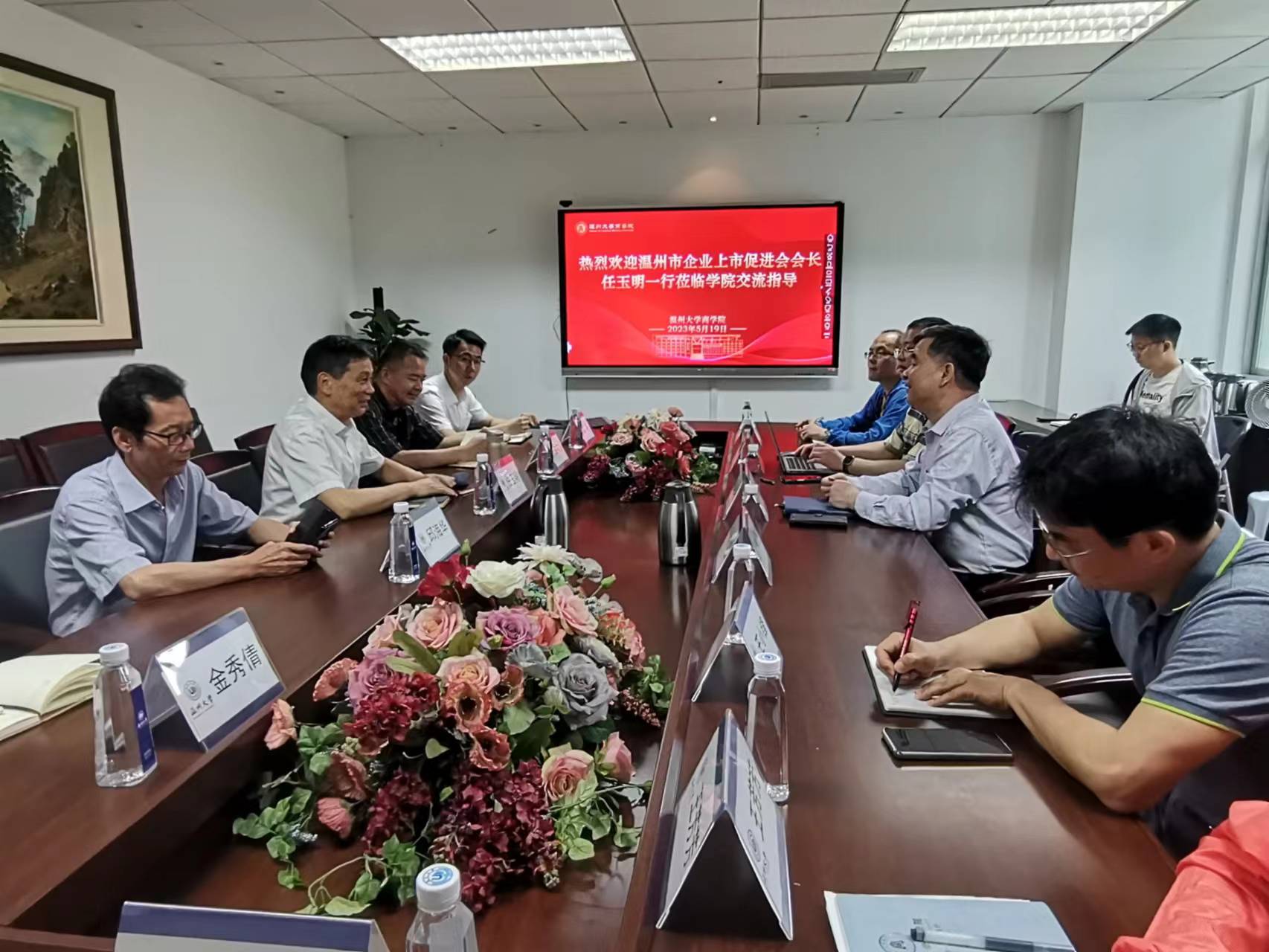 5月19日上午,温州市企业上市促进会会长任玉明一行五人莅临商学院交流指导,温州大学副校长徐和昆、商学院党委书记李密、商学院副院长余向前在A222会议室接待了来宾,金融系和工商系骨干教师们参加了会议。