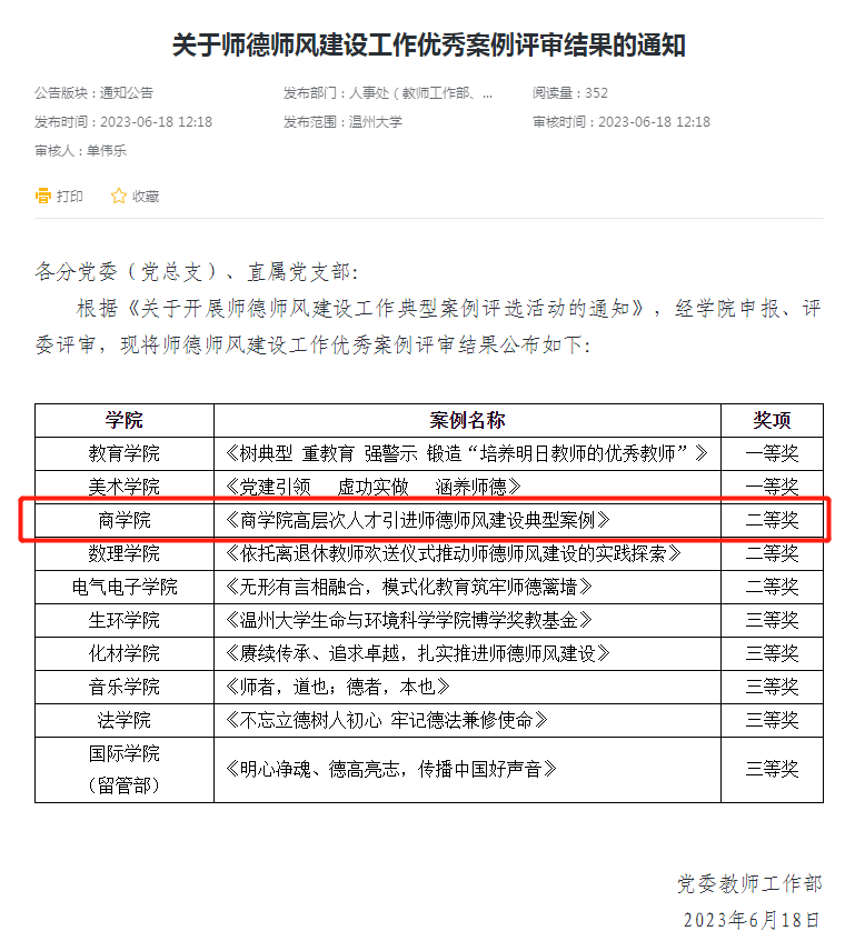 商学院高层次人才引进师德师风建设典型案例获温州大学师德师风建设工作典型案例二等奖。
