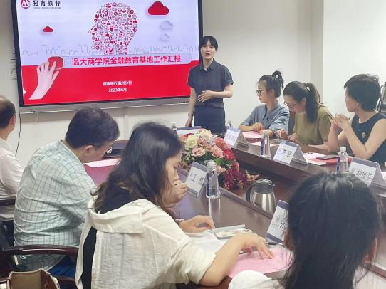 参观完金融教育文化长廊,王巍科长一行随即在会议室举行了研讨交流。为了让来宾们更加直观地了解温州大学商学院和省级金融教育示范基地,现场播放了温州大学商学院宣传片和浙江省金融教育示范基地宣传片。招商银行温州分行消保中心麻诗谨作基地汇报展示。她提到,自成立以来,基地以“金融为民、立德树人,共创美好生活”为工作方针,以公益性、实效性、创新性、持续性为原则,相继开展了10余次大型主题活动,并量身定制金融课程,组织各类公益、社会实践,把金融安全送进院校宿舍、社区楼宇、田间地头,两年间金融知识普及宣讲活动受众覆盖达10万人次。基地的打造,既得益于温州大学开放办学的理念,也是招商银行温州分行“金融为民、金融向善”初心的践行。