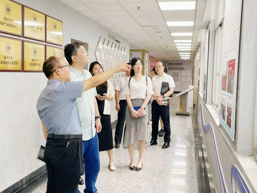 王巍科长一行首先参观了温大商学院金融教育示范基地文化长廊,基地副主任唐华副书记详细介绍了基地建设和活动开展情况。王巍科长对商学院通过成立党员金融公益宣讲团向高校大学生、周围社区居民等开展常态化金融宣讲的做法表示赞赏,对基地工作人员的努力付出和取得的成绩表示充分肯定,对温大商学院和招商银行温州分行“银校共建”强强联合的建设模式给予了高度肯定。