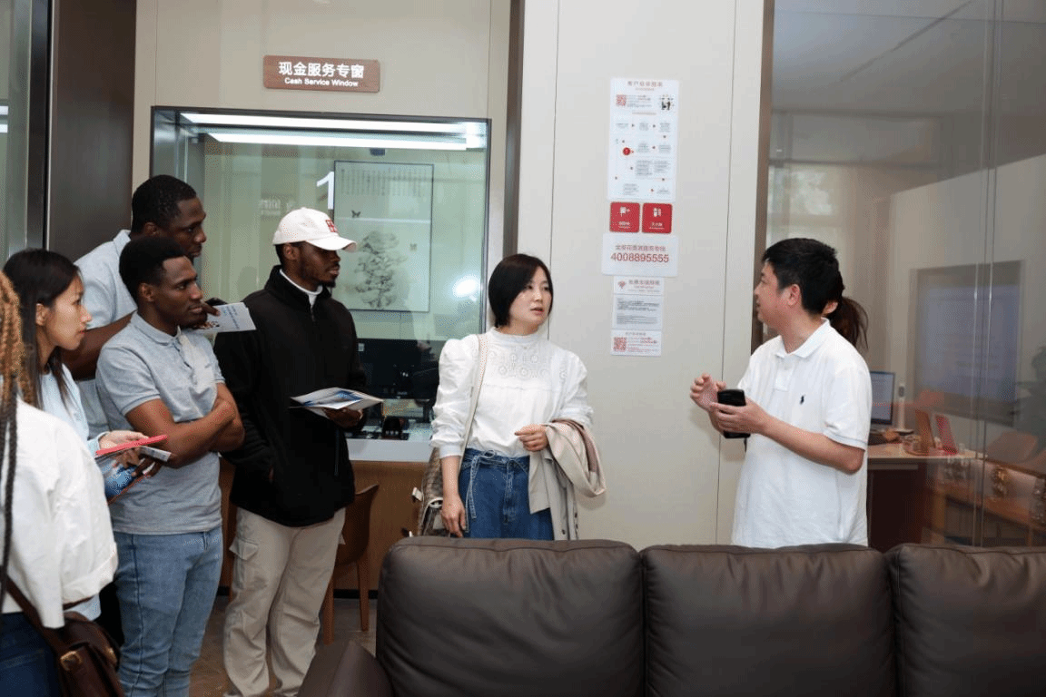 在金融服务体验环节,分行营业部工作人员引导温大商学院金融工程系学生对营业部的各营业区域进行参观,分行工作人员依次介绍了网点客户接待区、理财专区、公众教育区、自助体验区等各区域设施和功能。在客户接待区,学生们了解了银行卡的基础知识,对卡通联名银行卡面爱不释手,同时,还体验了银行为客户提供的桌面充电设施;在理财专区,学生们了解购买理财产品的基本步骤,知道为什么购买理财产品要做双录,以及如何保护自己的知情权和自主选择权;在公众教育区,学生听了银行老师对防范非法集资、防范电信诈骗和银行卡安全使用的知识介绍;在自助体验区的征信查询机前,部分学生还拿出身份证,打印了自己的第一份征信报告,了解了良好的征信记录对自己意义。值得一提的是,本次活动参加的学生还包括了10余位金融工程系硕士留学生,为提升外籍学生的金融服务体验,分行营业部工作人员特意为其介绍了我行对境外人员提供的便利服务,如特设窗口、英文服务指南、外币兑换币种介绍等。
