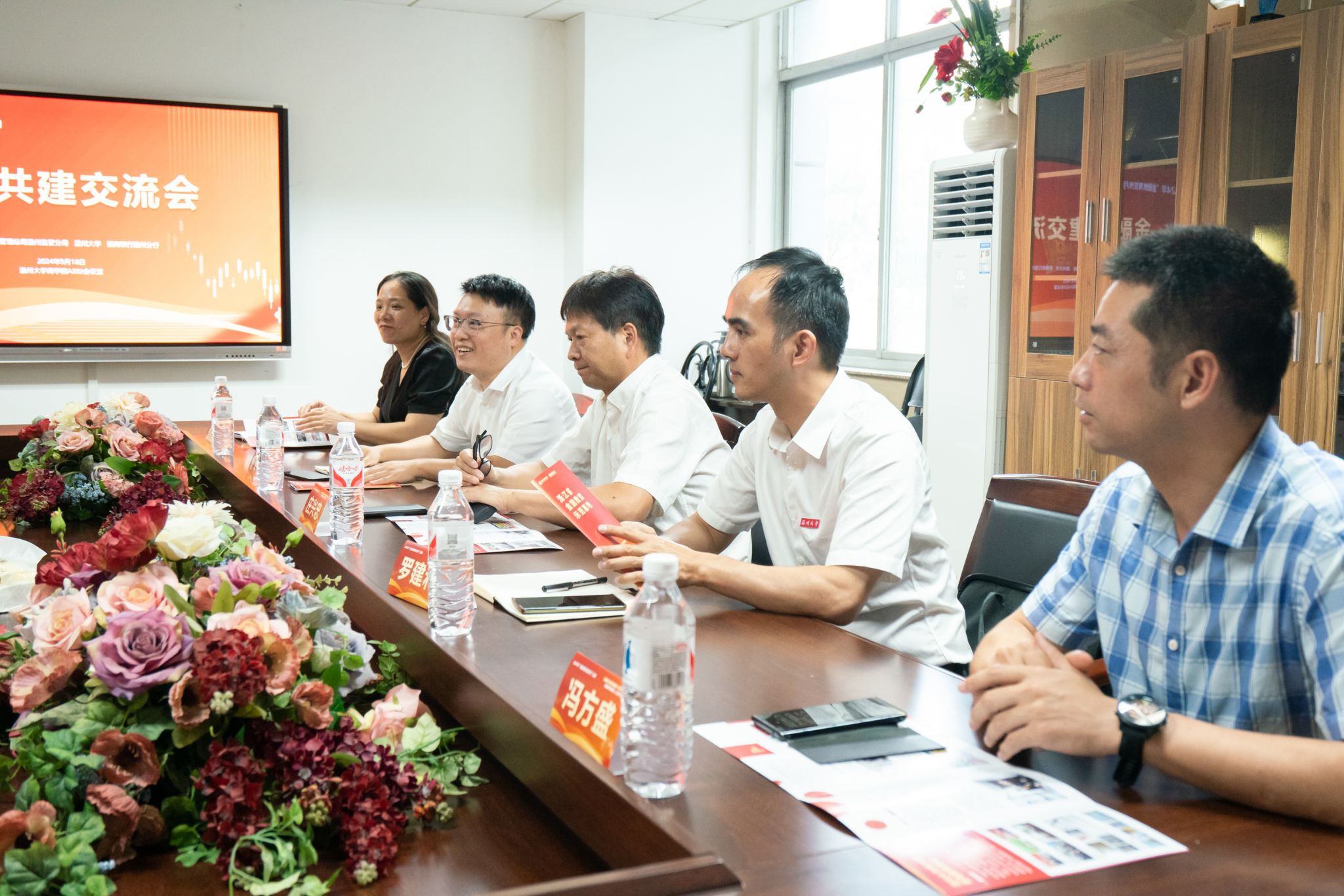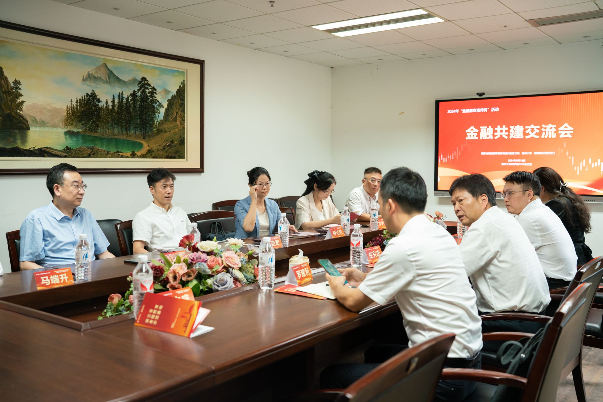 活动正式开始前,温州大学党委副书记庄兴忠,温州大学保卫部部长冯方盛,温州大学商学院院长罗建利、党委书记唐华、党委副书记曾蓓蕾与国家金融监督管理总局温州监管分局局长朱燕军、副局长钟洁慈,招商银行温州分行行长袁森等就“银校金融共建”进行座谈交流。