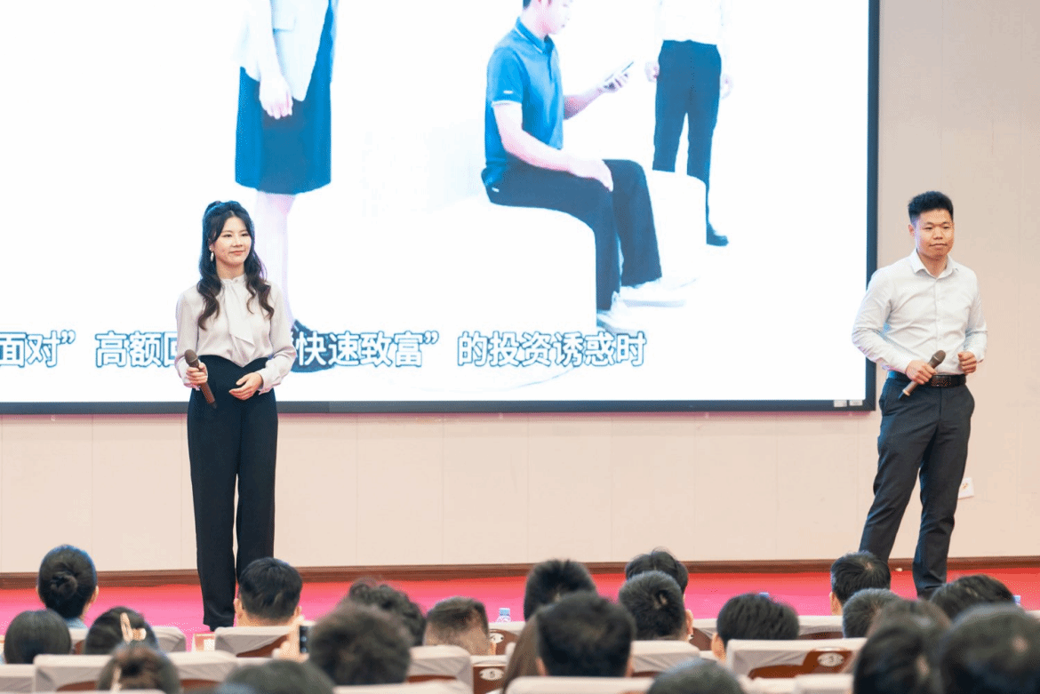 活动中,为增强金融教育的实效性和趣味性,各家联办金融机构各出奇招,分别带来了反诈小品《贵妃理财》、金融知识串烧《海市蜃楼/一路有“保”》、反诈歌曲《爱你》、脱口秀《银行二三事》,巧妙地将金融知识与轻松幽默的脱口秀、朗朗上口的反诈歌曲、寓教于乐的反诈小品相融合,为师生们带来了一场沉浸式的金融教育盛宴。