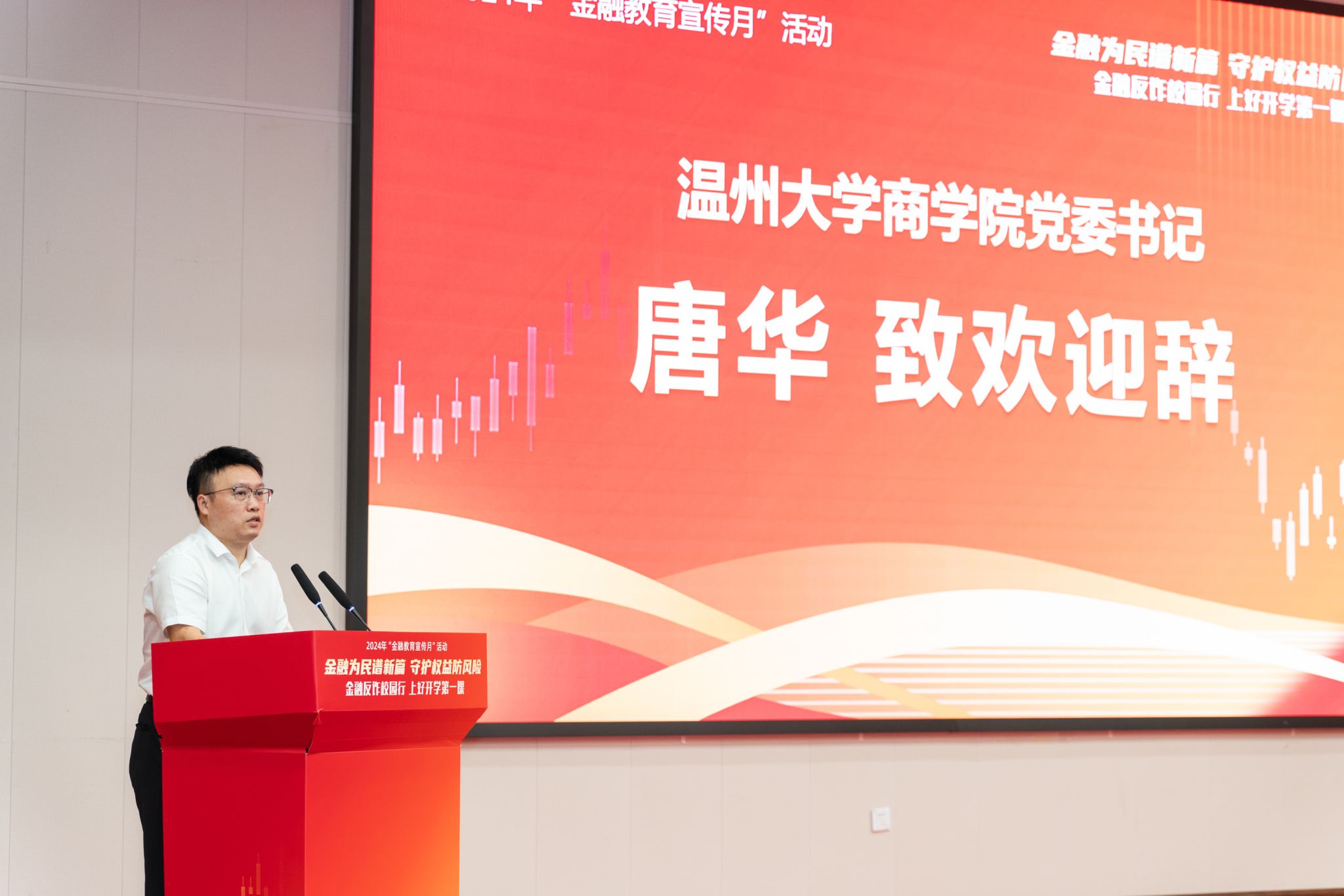 活动在金融教育示范基地宣传片的播放中拉开序幕,温州大学商学院党委书记唐华在欢迎辞中简要介绍了学院的发展情况以及获批省级金融教育示范基地以来联合招商银行温州分行等金融机构的建设举措与取得成绩。他表示,温州大学商学院金融教育示范基地将在“做金融明白人”统一品牌的框架下,按照国家金融监督管理总局温州监管分局的部署,会同招商银行等全市金融机构,聚焦反诈防骗、理性投资和依法维权三大内容,开展一系列丰富多彩的活动,让金融知识走进校园、走进社区、走进企业、走进农村(“四进”行动),共同筑牢金融消费者合法权益防护网。同时,他还向长期以来支持学院开展金融教育的国家金融监督管理总局温州监管分局、温州市金融办、中国人民银行温州市中心支行以及各大银行、证券和保险等金融机构表达了诚挚的谢意。