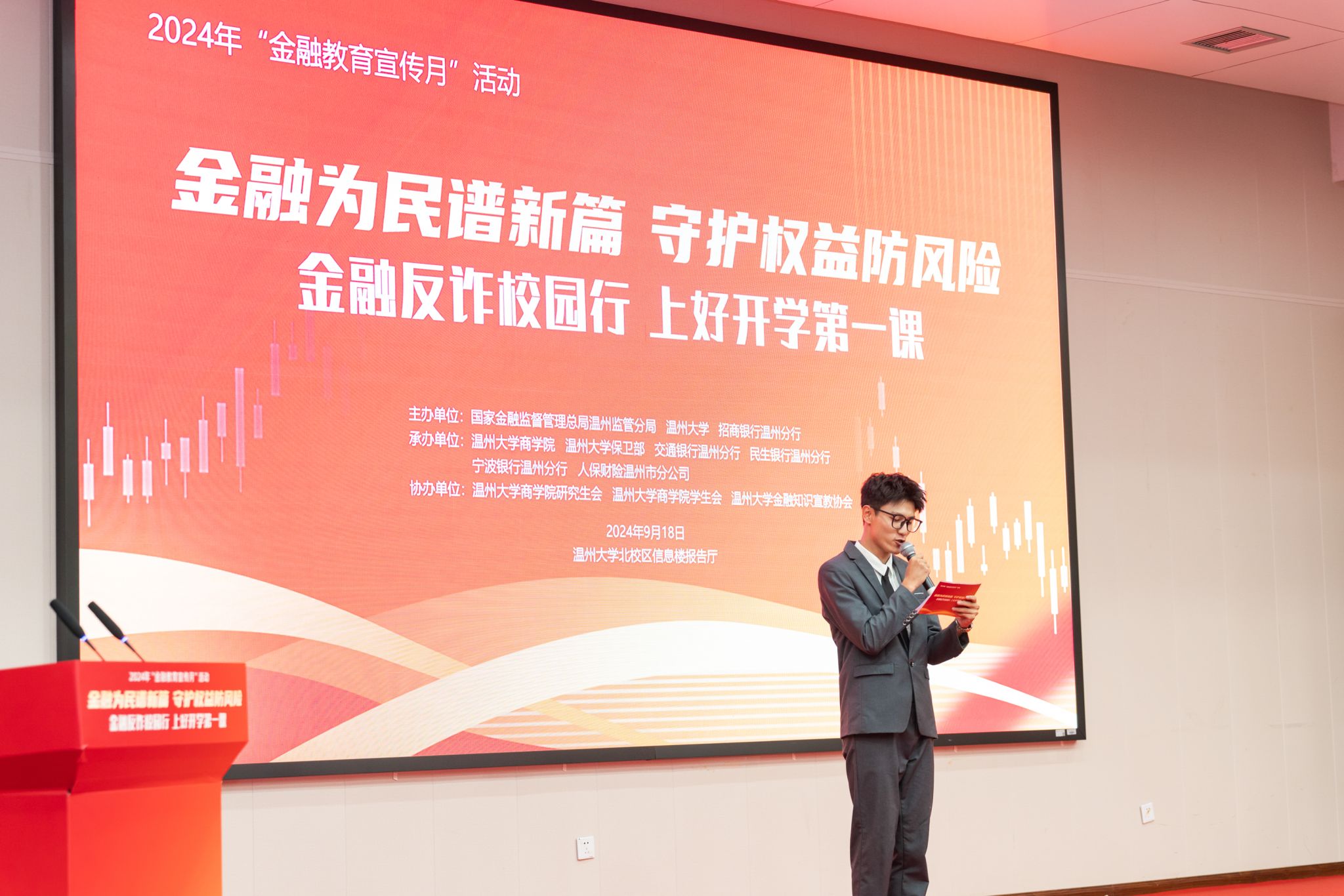 为提升大学生金融素养,有效防范和化解金融风险,做好金融教育宣传月系列活动,9月18日,温州大学商学院联合国家金融监督管理总局温州监管分局、招商银行温州分行、温州大学保卫部等单位,共同主办“金融为民谱新篇,守护权益防风险”主题活动。近300位师生参加了本次活动。