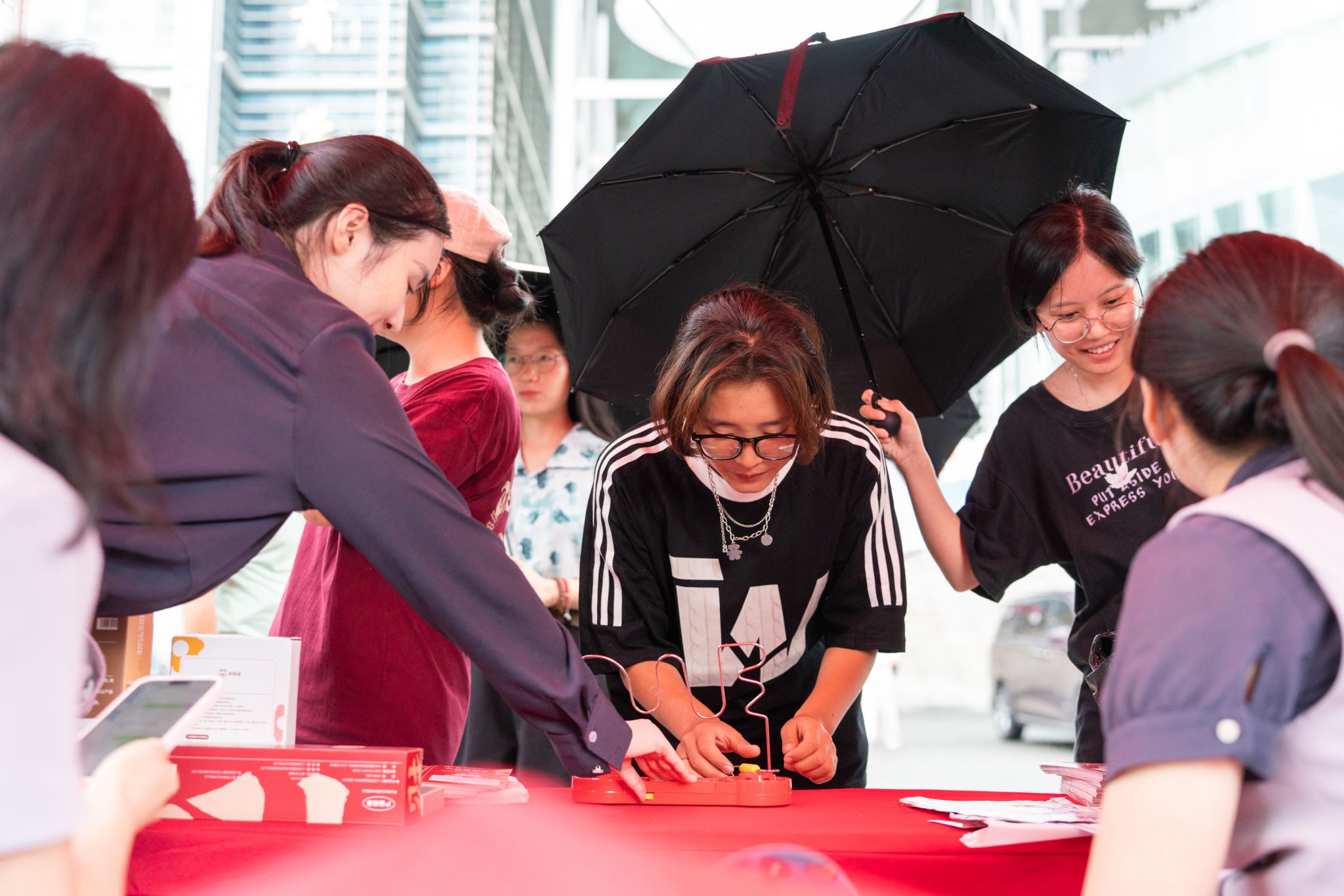 为扩大金融教育的覆盖范围,在室内举办主题活动的同时,温州大学商学院联合金融机构还在学院广场举办了一场别开生面的金融集市活动。此次活动通过创新的形式,如引人注目的反诈打卡墙、富有创意的反诈知识标语墙、活力四射的反诈能量站,以及互动性极强的反诈体验区,吸引了大量学生参与。反诈打卡墙前,大学生们纷纷加入“反诈阵线联盟”,在快门“咔嚓”声中记录下自己的反诈承诺,将正能量的互动传递给每一位参与者。反诈标语墙上,一系列风趣幽默的标语如“骗子退退退”“话里有话、小心有诈”吸引了众多学生的目光,让反诈意识在轻松愉快的氛围中深入人心。在反诈能量站,大学生们积极参与体能测试和反诈训练营,通过一系列别出心裁的互动体验,将反诈知识与趣味活动完美结合,使得反诈宣传变得生动而富有吸引力。