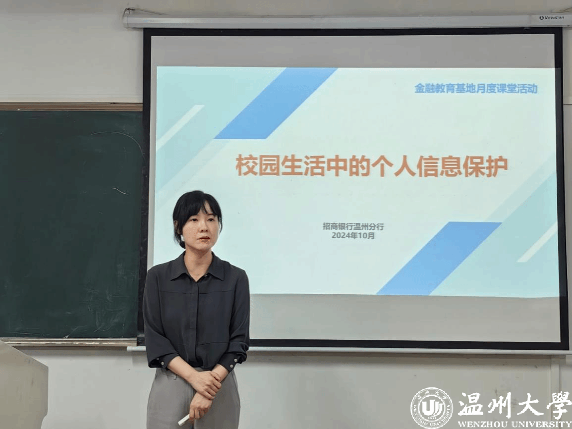 为进一步宣传金融安全知识,提高防范意识,帮助当代大学生树立正确消费观念,预防潜在的校园信息及信用卡安全,2024年10月23日下午,温州大学金融知识宣教协会邀请了招商银行温州分行的讲师麻诗瑾、娄志标为同学们带来专题讲座“校园生活中的个人信息保护”和“信用卡应知小知识”。