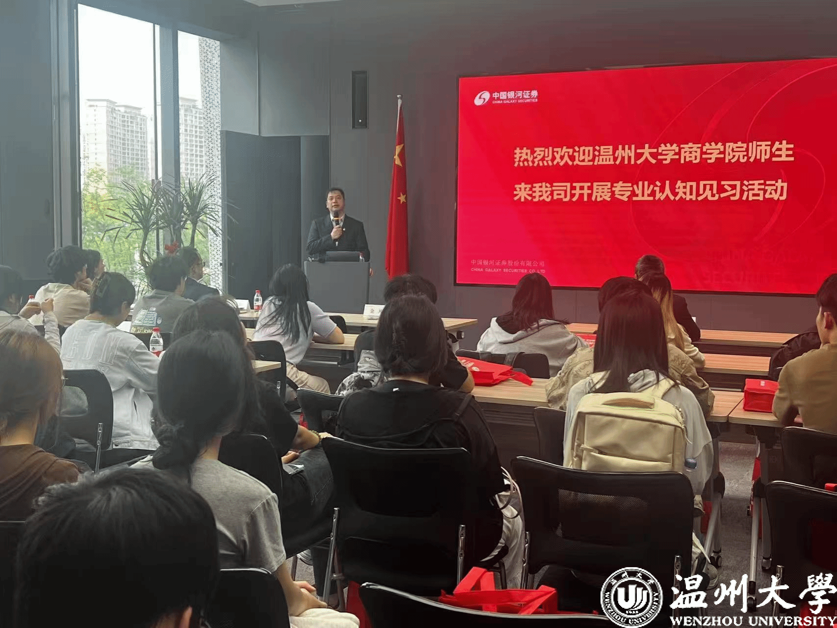 4月16日,温州大学商学院教工第一党支部以“党建+专业见习”为主题,由金融工程系主任、党支部副书记林德根带队,组织24级金融工程专业学生走进中国银河证券温州三友路营业部,开启了一场“行走的金融课堂”。支部充分发挥"党建引领、双师联动"机制优势,将专业见习与红色教育深度融合,通过参观红色金融阵地、聆听党员先锋讲座、对话行业骨干党员三大模块,构建沉浸式实践育人体系。在营业部党建文化墙前,林德根副书记现场讲授微党课,结合证券行业发展历程解读“金融为民”初心使命,引导学生感悟新时代金融从业者的责任担当。