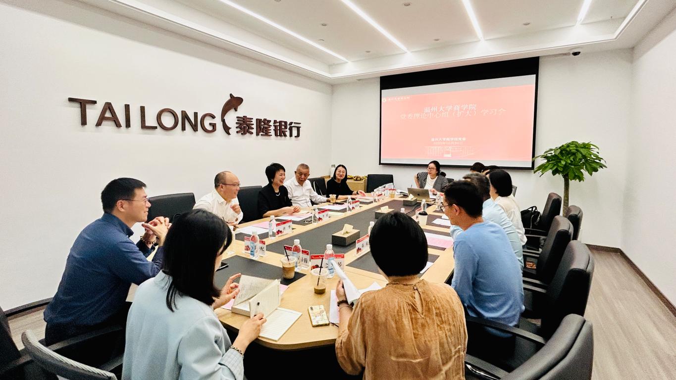 10月24日下午,温州大学商学院党委于泰隆银行龙湾支行“人才之家”共享会议室召开“第一议题”暨2023-2024学年第一学期第二次理论学习中心组(扩大)学习会。会议由李密书记主持,学院班子成员、党委委员、各教工支部书记、系主任、科室主任、教师代表参会。