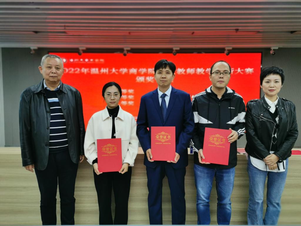 会议举行了2022年温州大学商学院院级教师教学创新大赛颁奖仪式,对金必简、姚鹏、陈明灼、王芳芳、姜亮等五位获奖的老师进行表彰。
