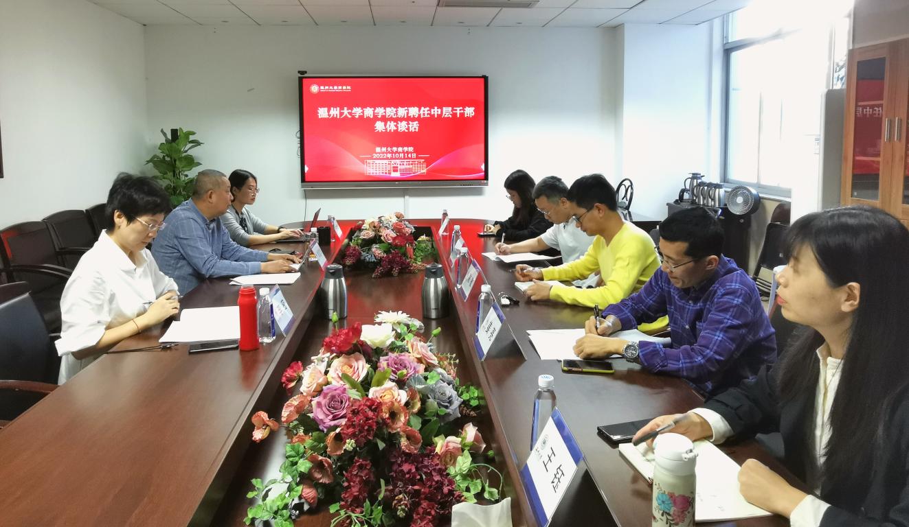 胡振华院长对五位新聘任的学院中层干部表示欢迎与祝贺,并开展集体谈话,他指出新上任的几位中层干部将是学院未来发展的中坚力量,学院的任免是着眼长远,优中选优的,希望大家不仅要做好自身业务及品德建设,更要懂得经营与管理,要在新的岗位上牢记初心使命,全力履职尽责,当好各系带头人,为商学院高质量发展做出贡献。他提出三点要求,一是要加强学习,二是要狠抓落实,三是清正廉洁、提高政治站位。他祝愿大家能在新的岗位上取得更好的成绩。