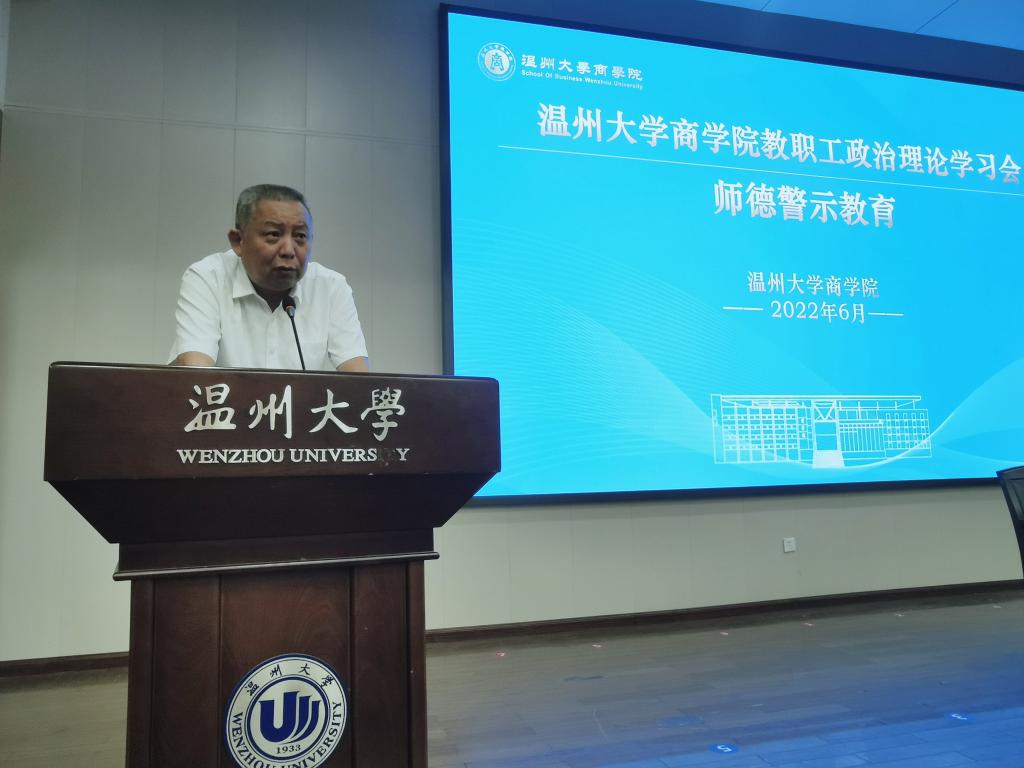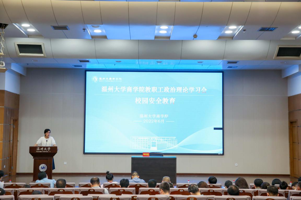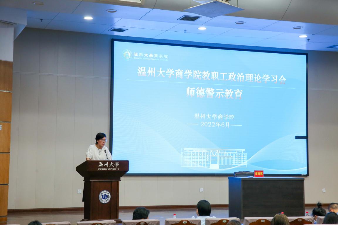 2022年6月8日,商学院在信息报告厅召开全体教职工理论学习大会及师德警示教育。全体教职工参加学习会,学院党委书记郑彩莲主持会议。