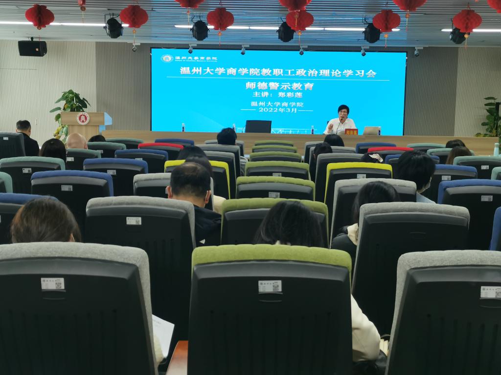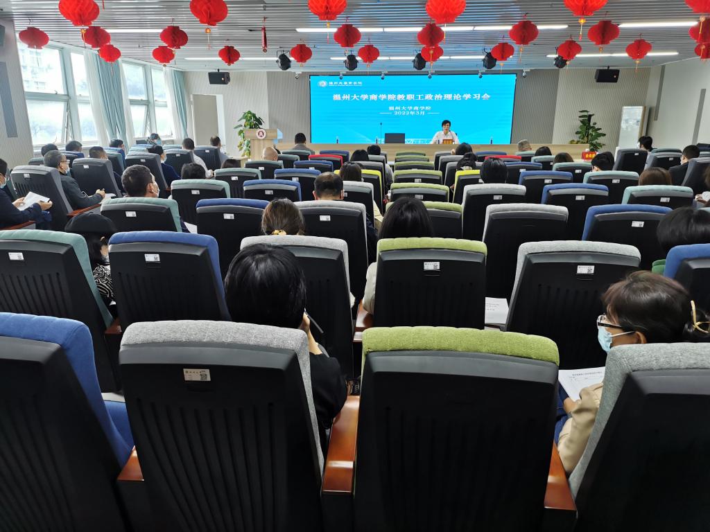 2022年3月16日,商学院在商院楼A226仲辉商道讲堂召开全体教职工理论学习大会。全体教职工参加学习会,学院党委书记郑彩莲主持会议。