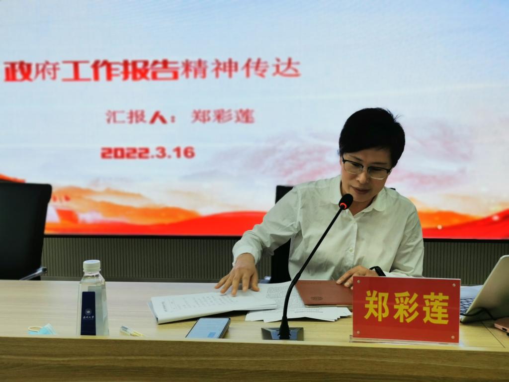 郑彩莲书记传达贯彻全国两会精神。她介绍了今年两会的重要背景、重要意义、重要议程。郑彩莲书记指出2022年全国两会的胜利召开具有非凡意义,习近平总书记在全国两会期间发表了重要讲话,提出了一系列新理念、新要求、新任务,同时今年两会对教育领域十分关注,对高等教育提出了更高的要求。她强调,一,要提高政治站位,老师们要学深学透全国两会精神。二,结合学校学院2022主题主线,对标对表,狠抓工作落实。三,统筹协调,科学有序安排各项工作。尤其要做好当下的研究生复试工作、疫情防控与发展“两手抓,两战赢”的工作,切实推动商学院与教育事业高质量内涵式发展,以优异成绩迎接党的二十大。