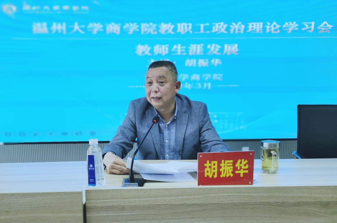 胡振华院长带领学院教职工学习教师生涯发展。他带领大家学习了《浙江省教育厅办公室关于征求对<“浙里优学”行动方案(征求意见稿)>意见的函》、《浙江省普通本科高校新文科建设实施方案(征求意见稿)》两份文件,并结合学院发展进行分析,他从科研、教学、人才培养、学历提升、职称申报、行政能力提升等多方面解析教师生涯发展规划,并希望老师们珍惜时间发展好自身职业生涯,并为学院和社会的发展多做贡献。