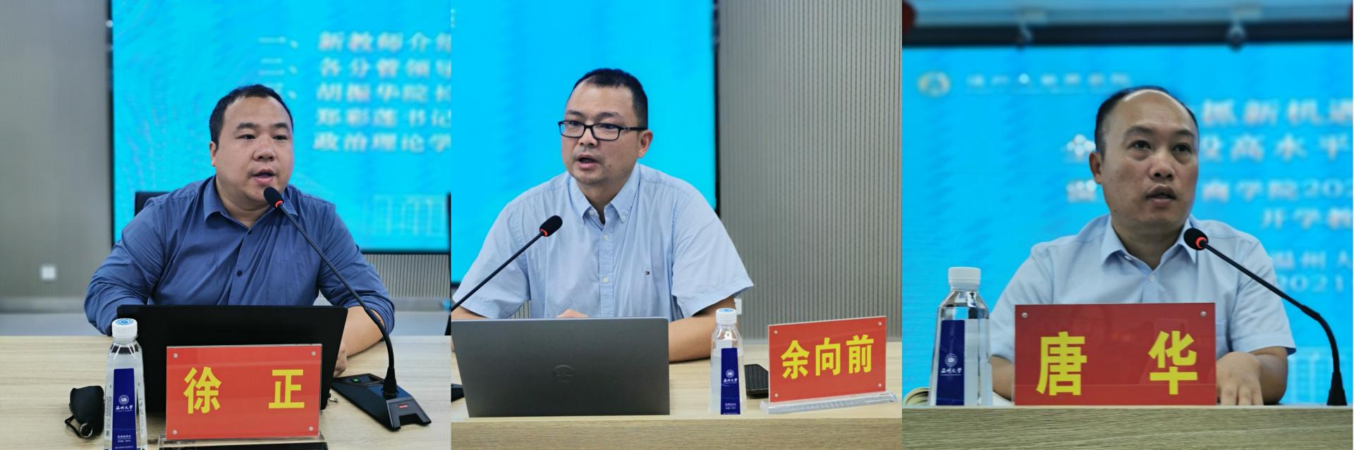 胡振华院长作开学讲话,他带领大家回顾了温州大学三大目标建设情况,商学院在专业建设、学科建设、教师队伍建设、平台建设、国际化建设、社会服务等方面都上了新台阶,商学院的发展进入新阶段,他对学院建设各方面提出了新的目标和挑战。他强调学院发展任务依然艰巨繁重,面临的挑战严峻,全体教职工要把“目标”刻在心上、把“执行”视为铁律、把“担当”作为自觉,要有功成不必在我、功成必定有我的精神,聚神聚力把各项工作抓实抓好,闯出自身发展和商学院发展的新天地!他还对商学院前不久获得2021年国家社科基金立项资助的张敏老师、金雯雯老师、郑阳阳老师和获得浙江省委书记批示的王露老师与张一力老师表示祝贺,并鼓励其他老师们继续努力,争取取得新突破新成绩。
