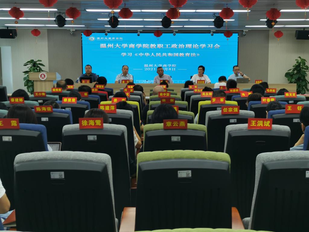 为深入学习宣传贯彻党的教育方针,全面落实立德树人根本任务,进一步加强和改进新时代教师队伍师德师风建设,全面提升教师思想政治素质和职业道德水平,办好人民满意的教育,值此第三十七个教师节来临之际,9月8日上午,商学院在仲辉商道讲堂组织学习新修订的《中华人民共和国教育法》,与党史学习教育相结合,做好新修订的教育法的学习宣传和贯彻实施工作,提高全体教职员工的政治站位和师风师德修养。学院全体教职工参加学习,学院党委书记郑彩莲领学。
