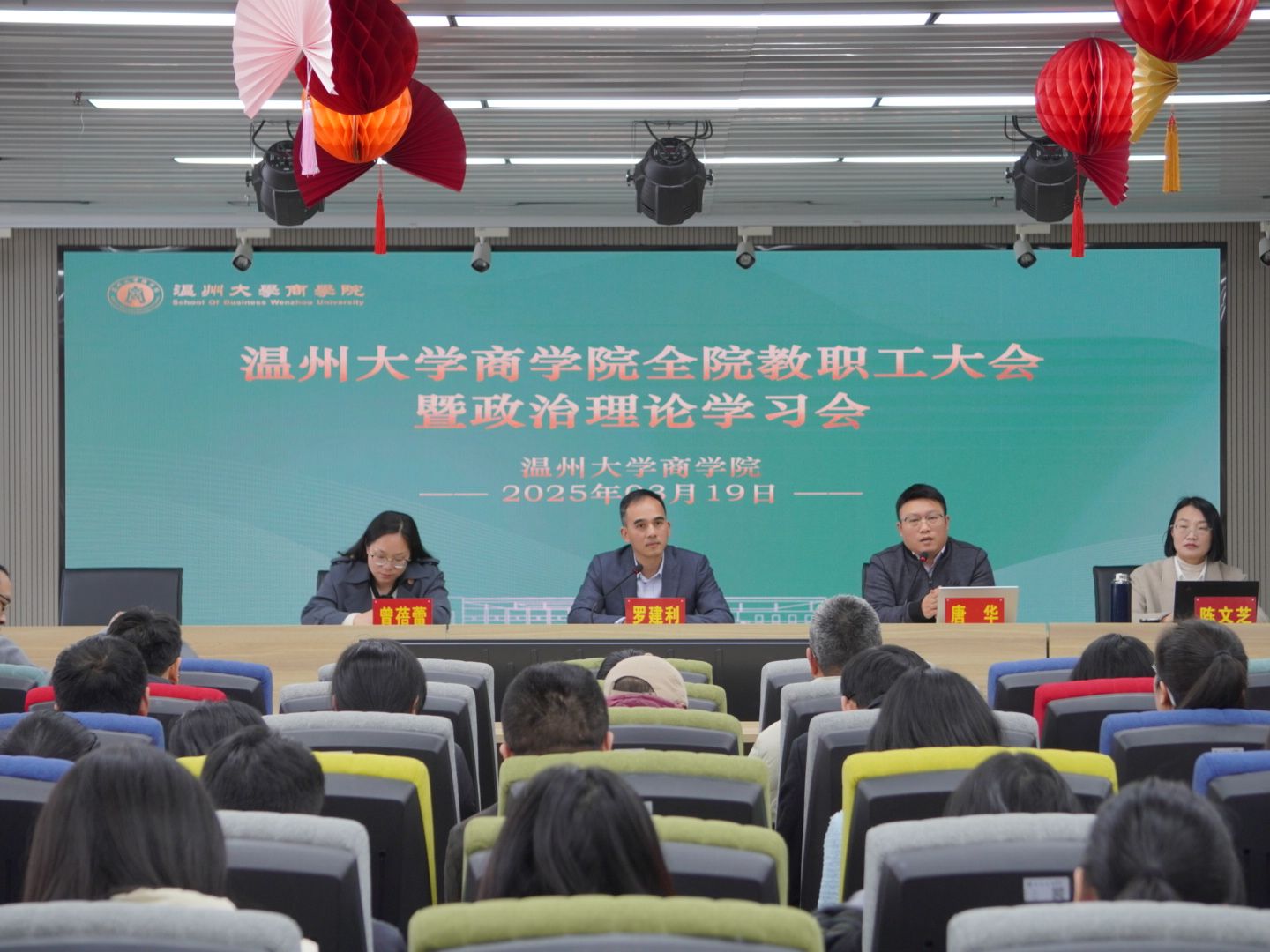 2025年3月19日下午,商学院在商院楼A226仲辉商道讲堂举行全院教职工大会暨政治理论学习会,会议由学院党委书记唐华主持,学院全体教职工参加。