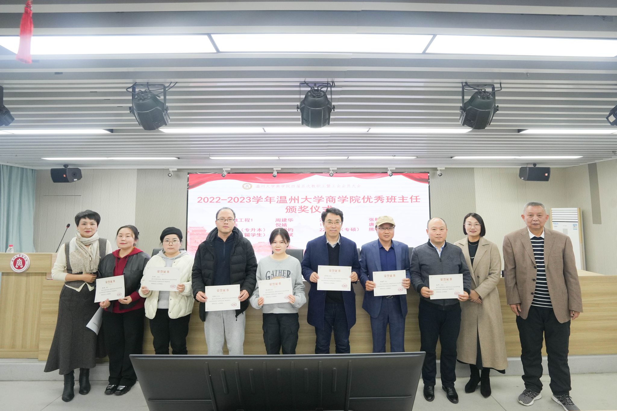 李密书记宣读了2022-2023学年温州大学商学院优秀班主任的文件并颁奖,周建华等7位老师获奖。