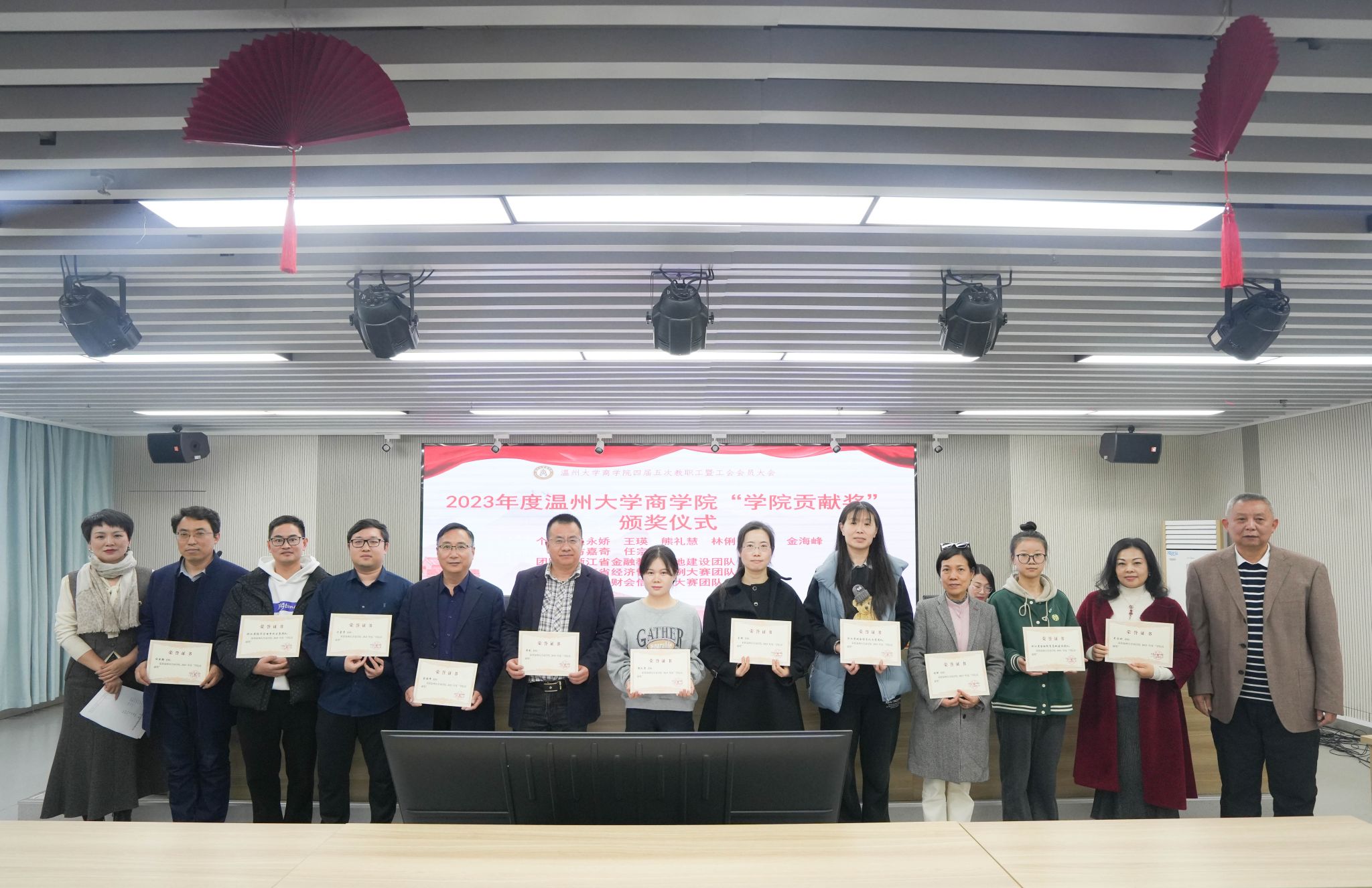 胡振华院长宣读了2023年度温州大学商学院“学院贡献奖”的文件并颁奖,吴永娇等8位老师和3个团队获奖。