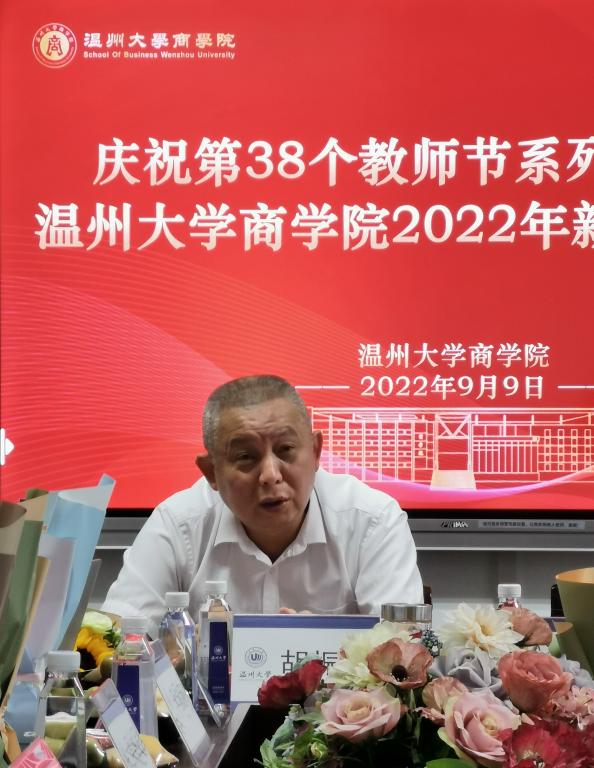 黄剑老师作为新教师代表在会上发言,他回顾了自己是如何转型教师行业的,对比了商业和教育两段职业生涯经历,他表示商业比教育更艰难,但是他更愿意在教育这条道路上不断投入时间和精力,潜心治学。对于此次加入温州大学商学院,他赋诗一首《鹧鸪天·赴温州任教》:驱车千里赴温州,旧时外贸曾访游,民营经济作支柱,共同富裕庆丰收入。瓯江水,雁荡秀,大浪淘沙数风流,今朝重返东海畔,心无旁骛唯潜修。